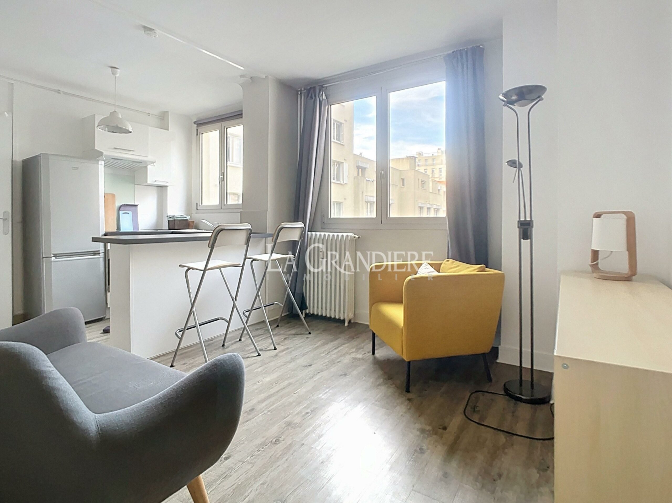 Au 2ème étage d’un bel immeuble de 1958, agréable studio meublé sur jardin comprenant une entrée avec placard, un salon avec une cuisine américaine, une salle de douche, un wc séparé et un coin buanderie. Clair – Calme – Lumineux.