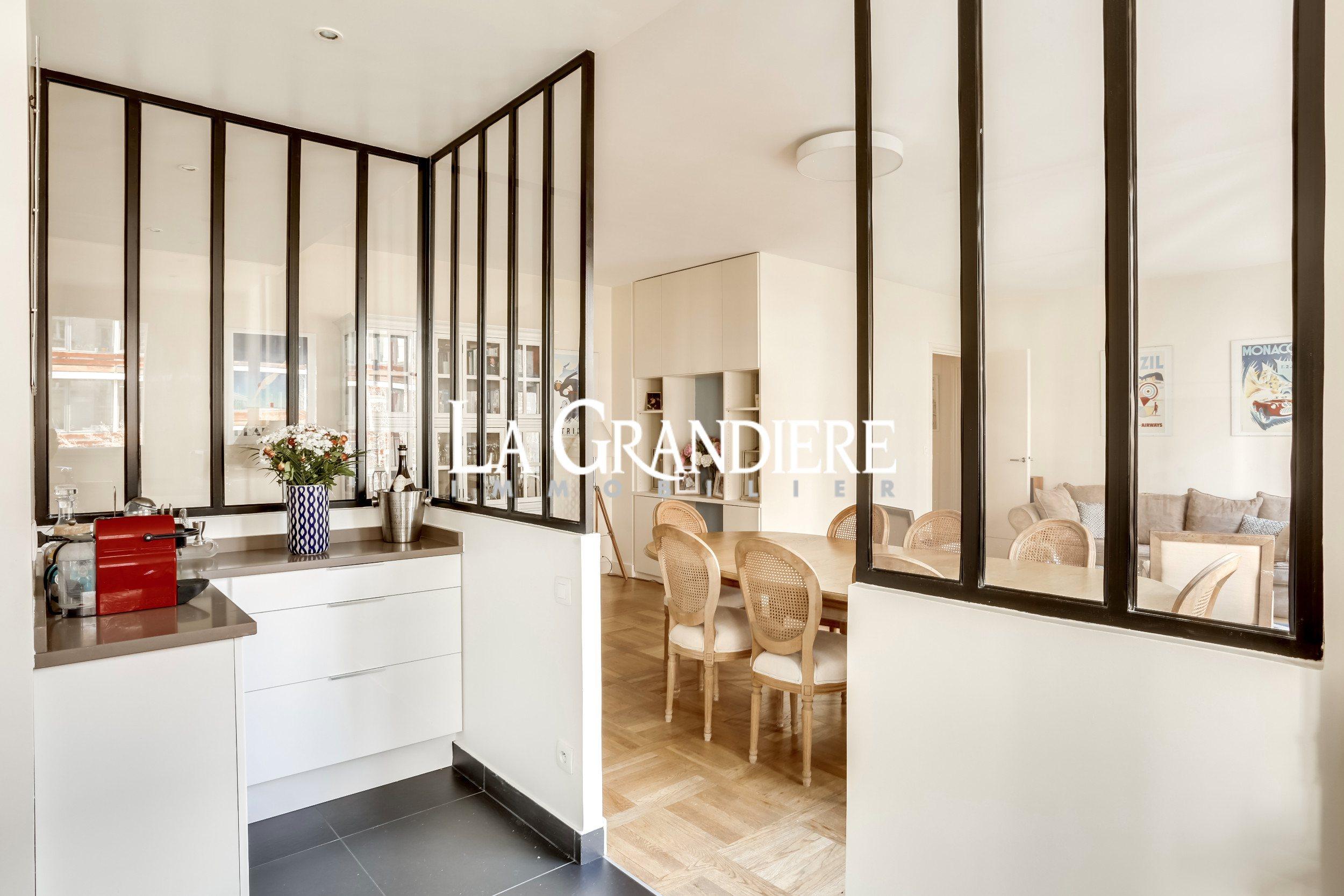 Boulogne Billancourt – Porte de Saint Cloud – 4 pièces – Traversant Est/Ouest – Parfait état – Dans une petite rue calme et résidentielle, au 1er étage d’un immeuble récent sécurisé par une gardienne et un digicode, un appartement lumineux de 87 m2 comprenant : un séjour spacieux de 36 m2 ouvrant sur un balcon, deux chambres dont une sur cour au calme, une cuisine semi-ouverte sur le séjour (10m2) avec le charme de la vitre atelier, un dressing, une salle de bains avec douche et baignoire, un wc séparé. Une cave complète ce bien. Appartement au calme – Bon plan.