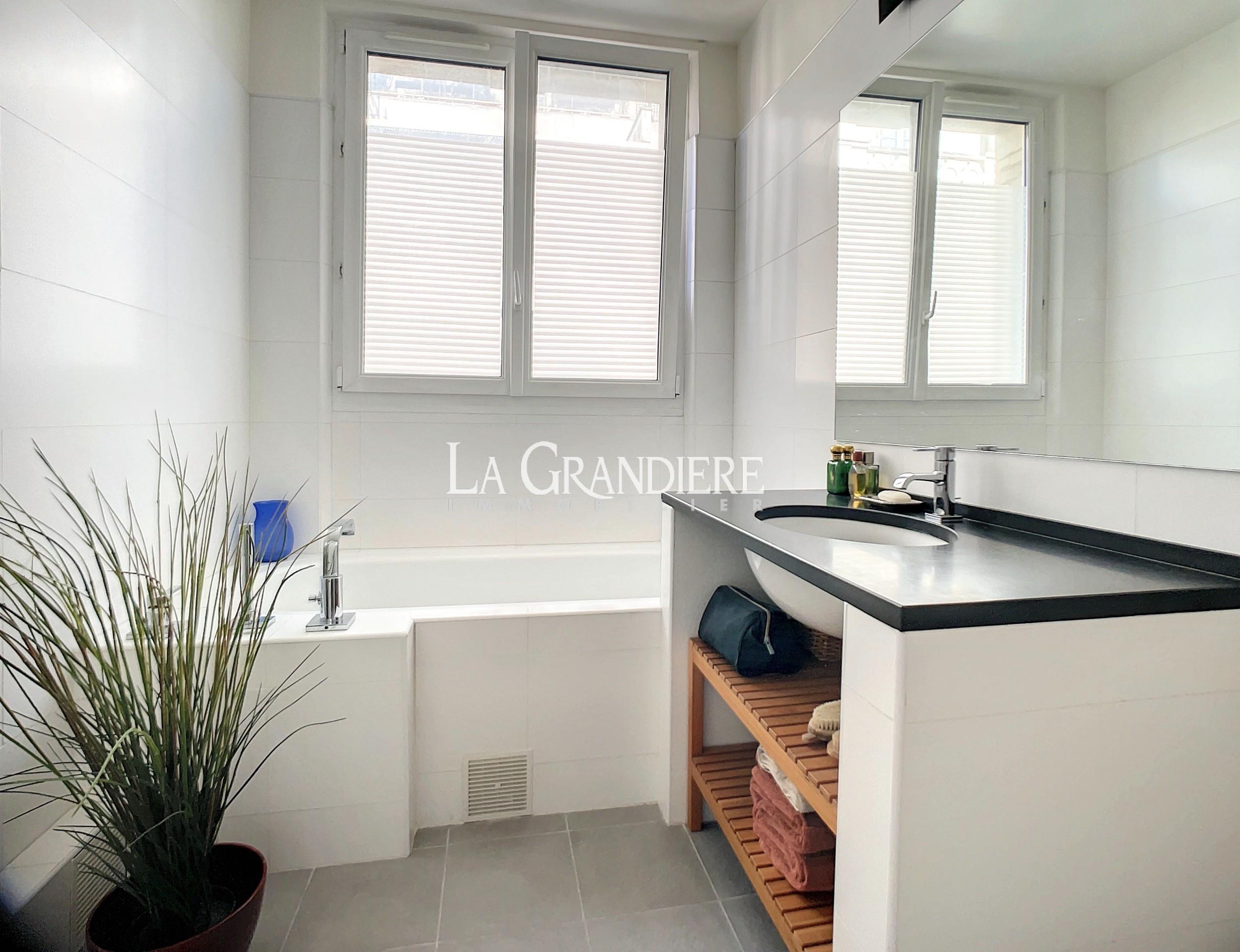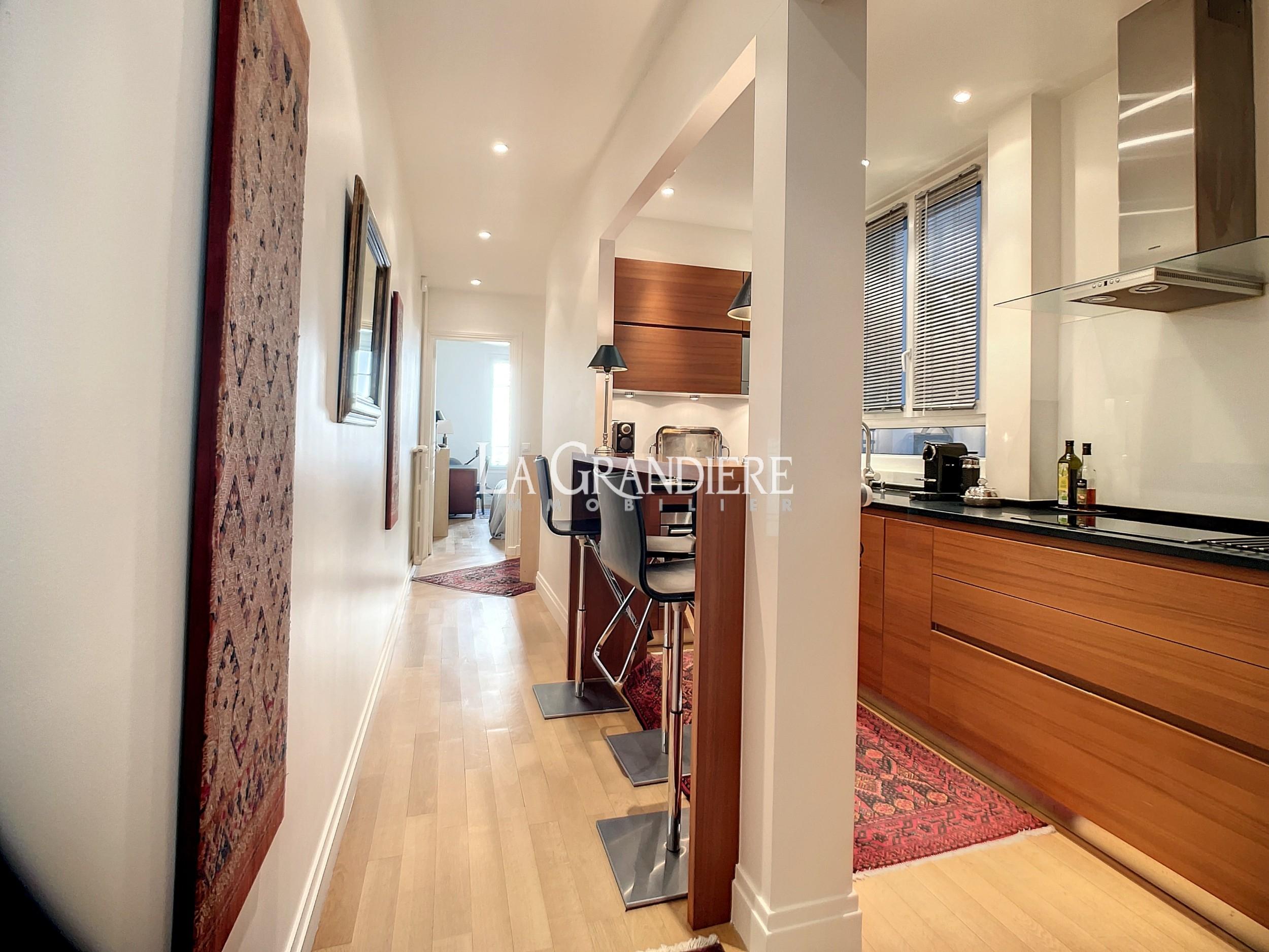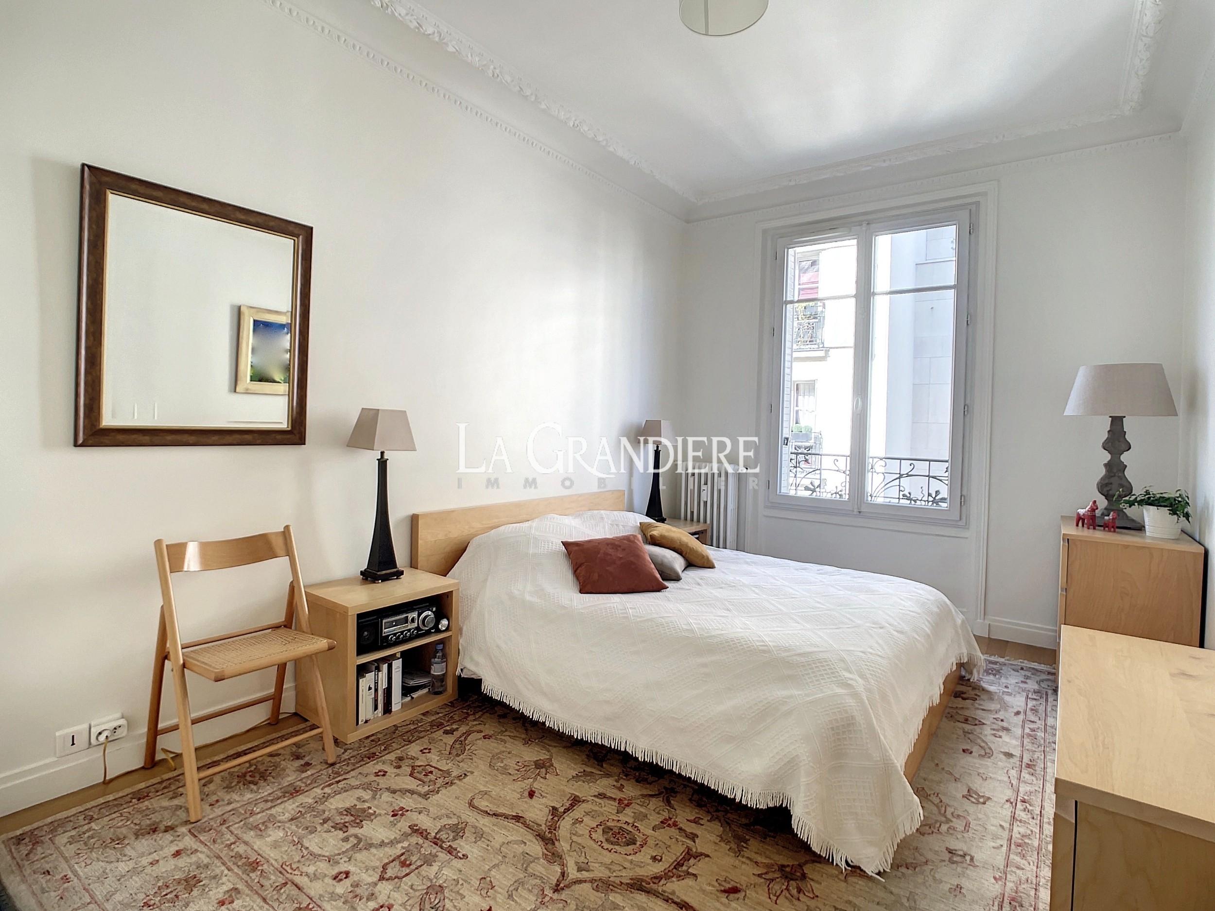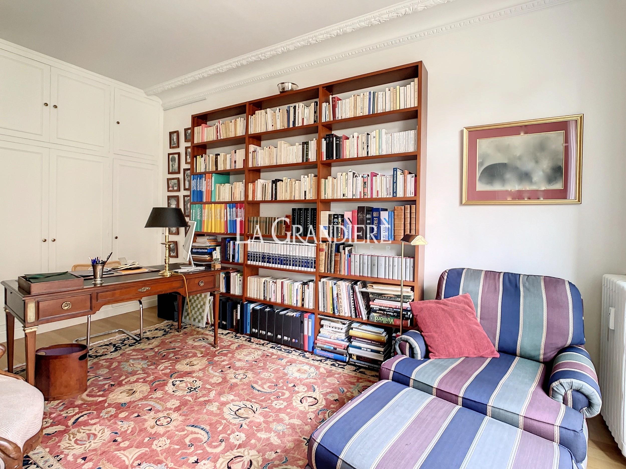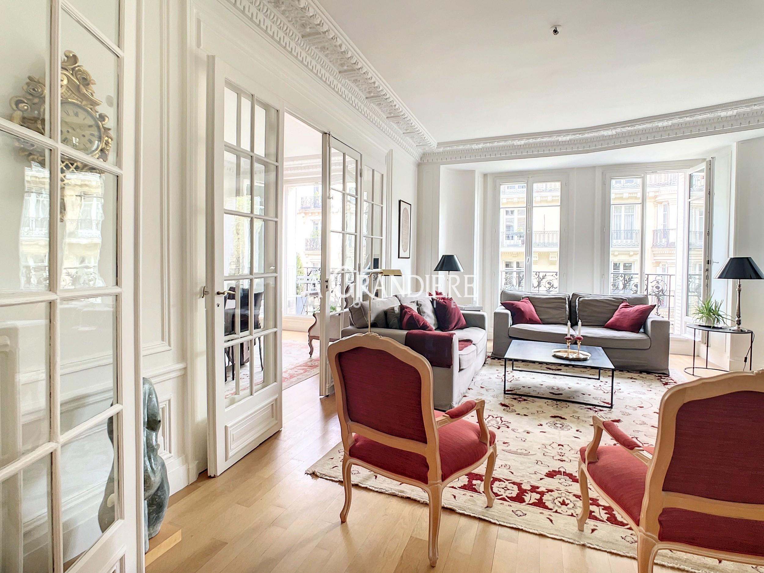 Paris 16ème – Jasmin, dans un immeuble pierre de taille édifié en 1890 sécurisé par un digicode, gardien et un visiophone, magnifique appartement familial de 5 pièces situé au 3e étage. Il se compose d’une grande entrée, une triple réception (salon, salle à manger, bureau ou 3ème chambre), deux chambres, une cuisine ouverte équipée, une salle de bains avec lingerie, une salle de douche, deux WC. Cave et débarras. Parquet, moulures, cheminées. Appartement très lumineux. Etat impeccable. Chambres au calme. Proche des transports, des commerces et des écoles. Possibilité d’achat de parking à proximité.