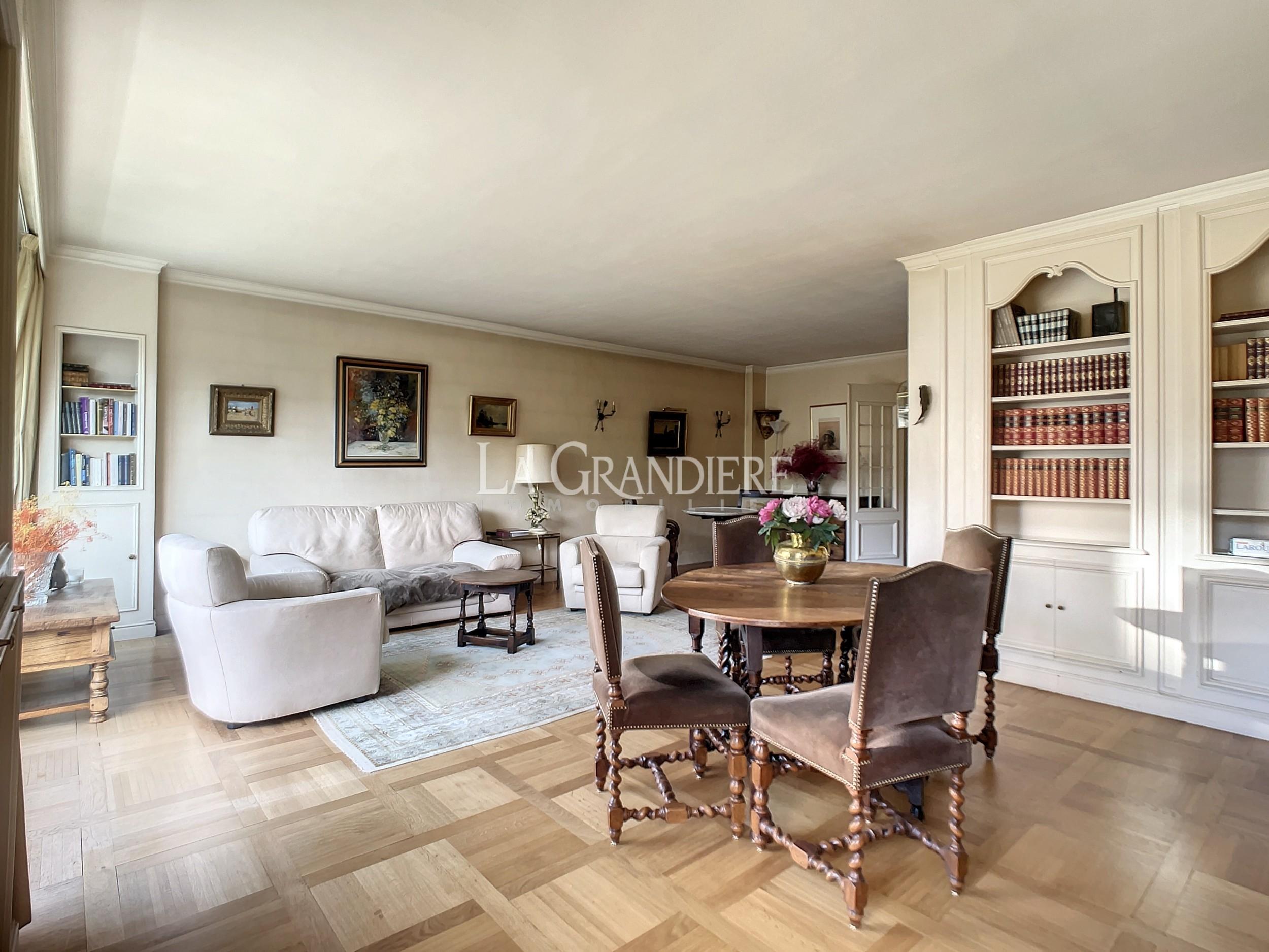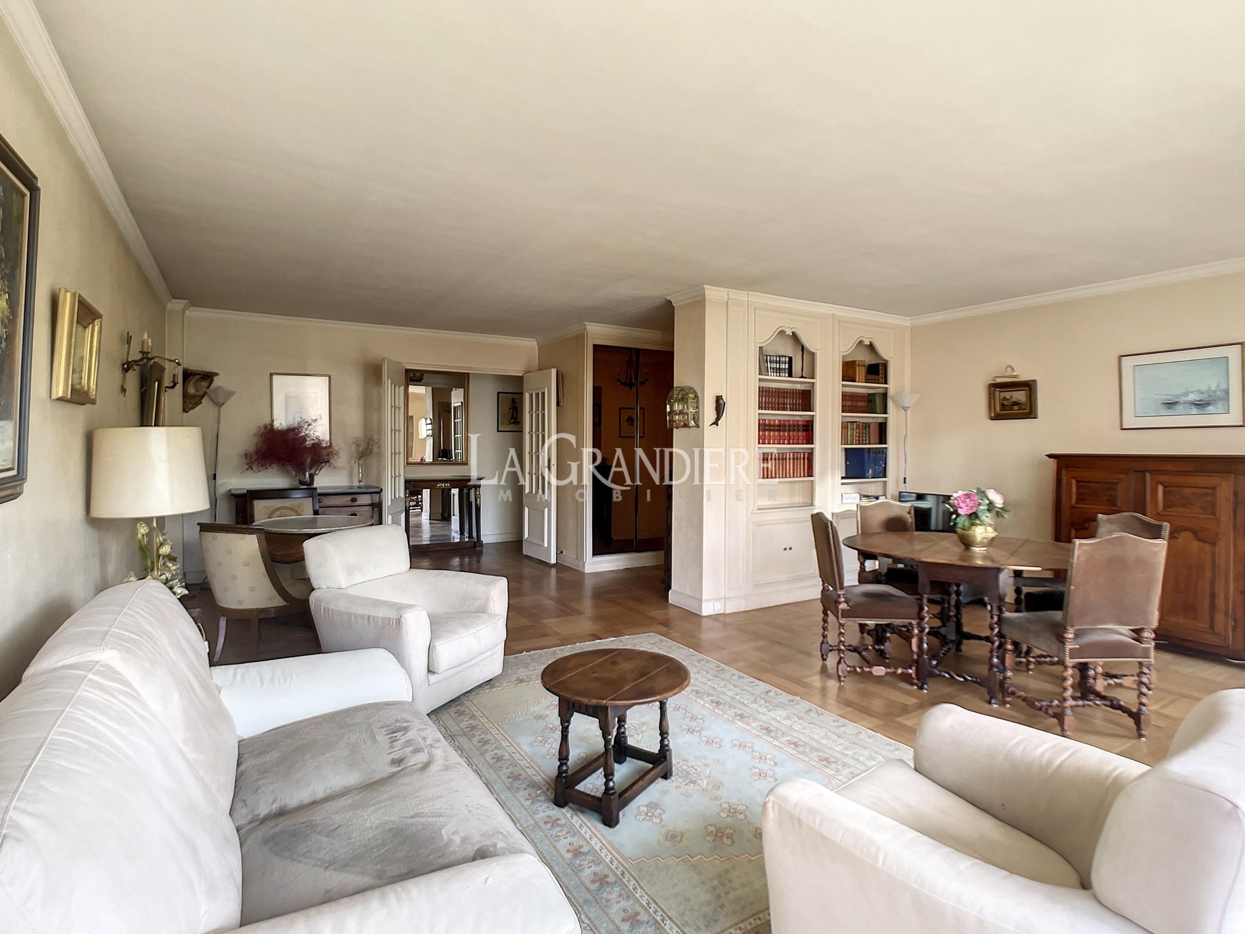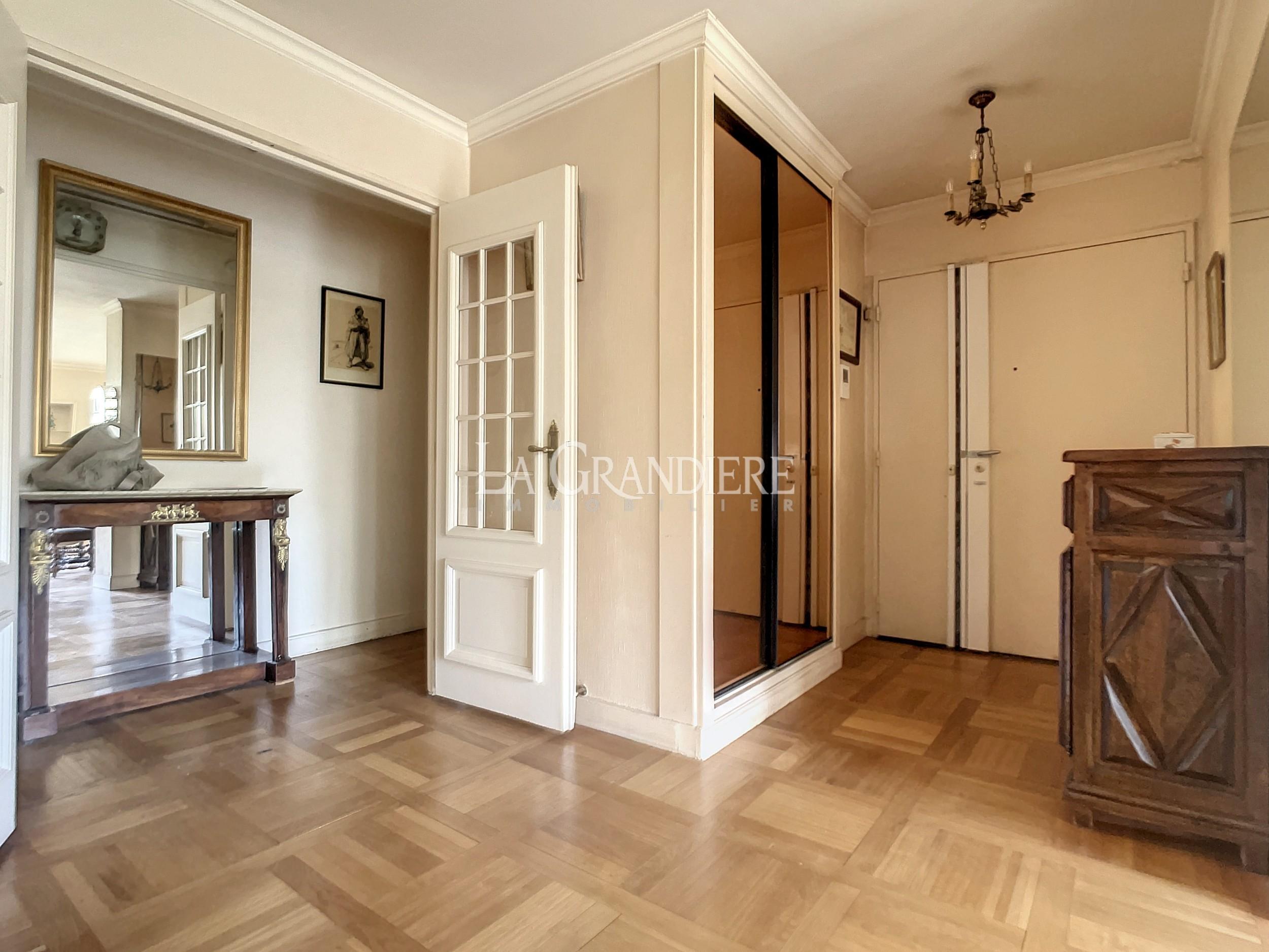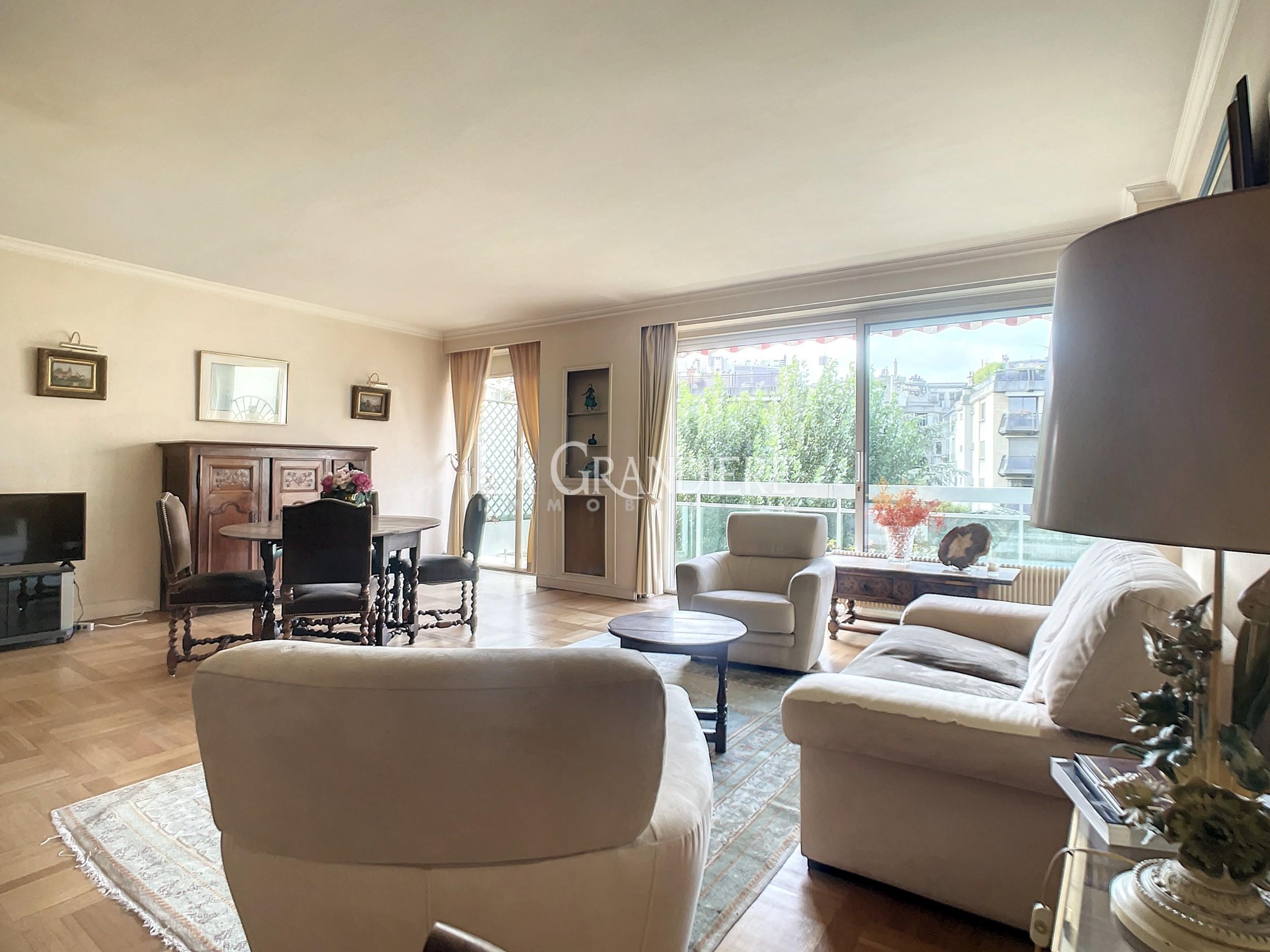 Au 7ème étage d’un immeuble 1964, appartement de 90,41 m2 Carrez. Il se compose actuellement d’une entrée avec placards, un très beau double séjour donnant sur un large balcon (baies vitrées) orienté Sud-Ouest, deux chambres, une salle de bains, un wc séparé et une cuisine séparée. Très bon plan, vue dégagée plein ciel et verdure – Calme absolu – Cave (7 m2) – Emplacement de parking dans l’immeuble pour 50 000 euros supplémentaires – Immeuble sécurisé par gardien, deux digicodes, un interphone – Deux ascenseurs dont un accessible directement du sous-sol (cave, parking, poubelles) – Nécessite quelques travaux de mise au goût du jour – À proximité de tous les commerces de première nécessité, Métro (Église d’Auteuil), des écoles (sectorisation Jean-Baptiste Say).