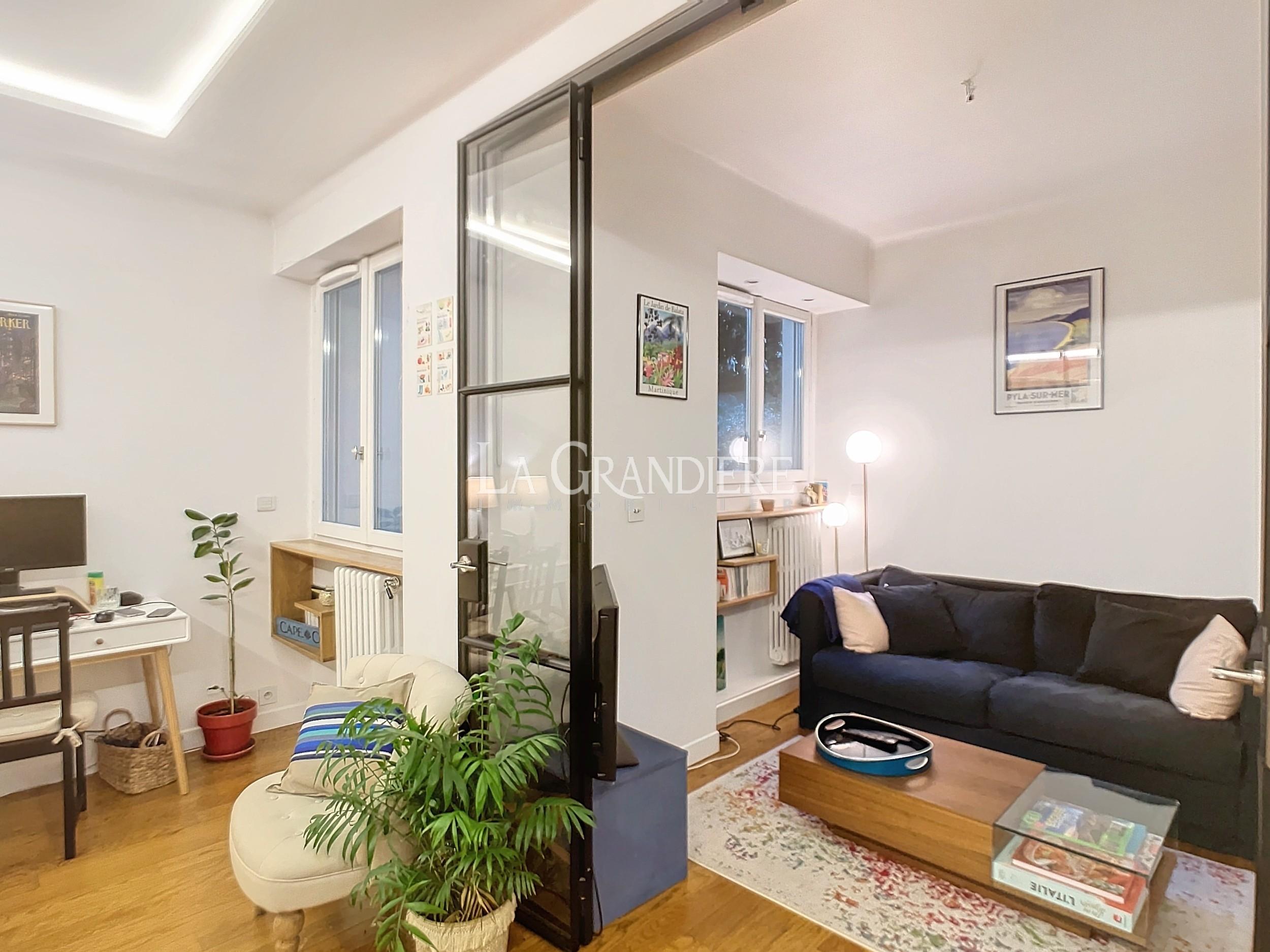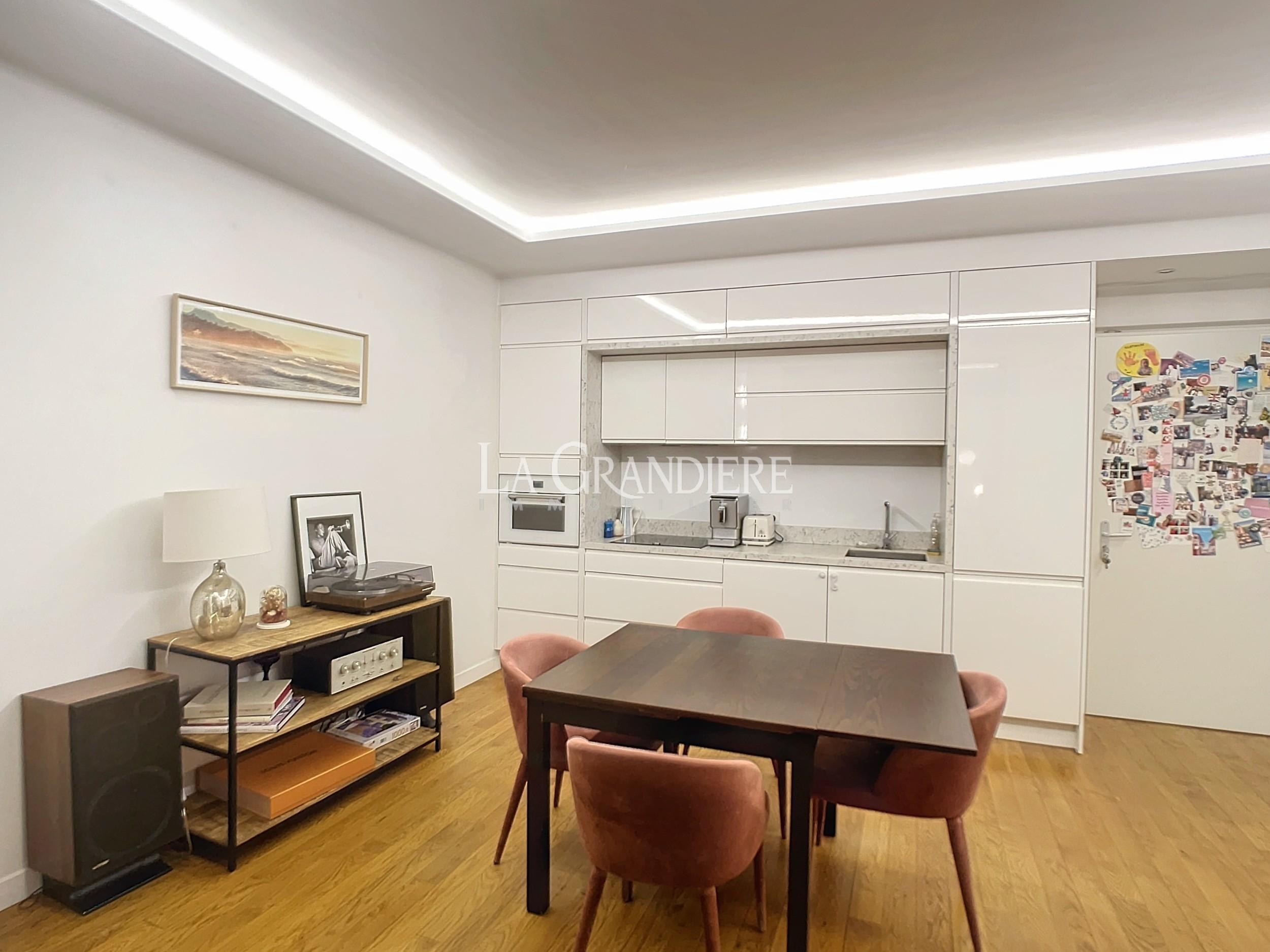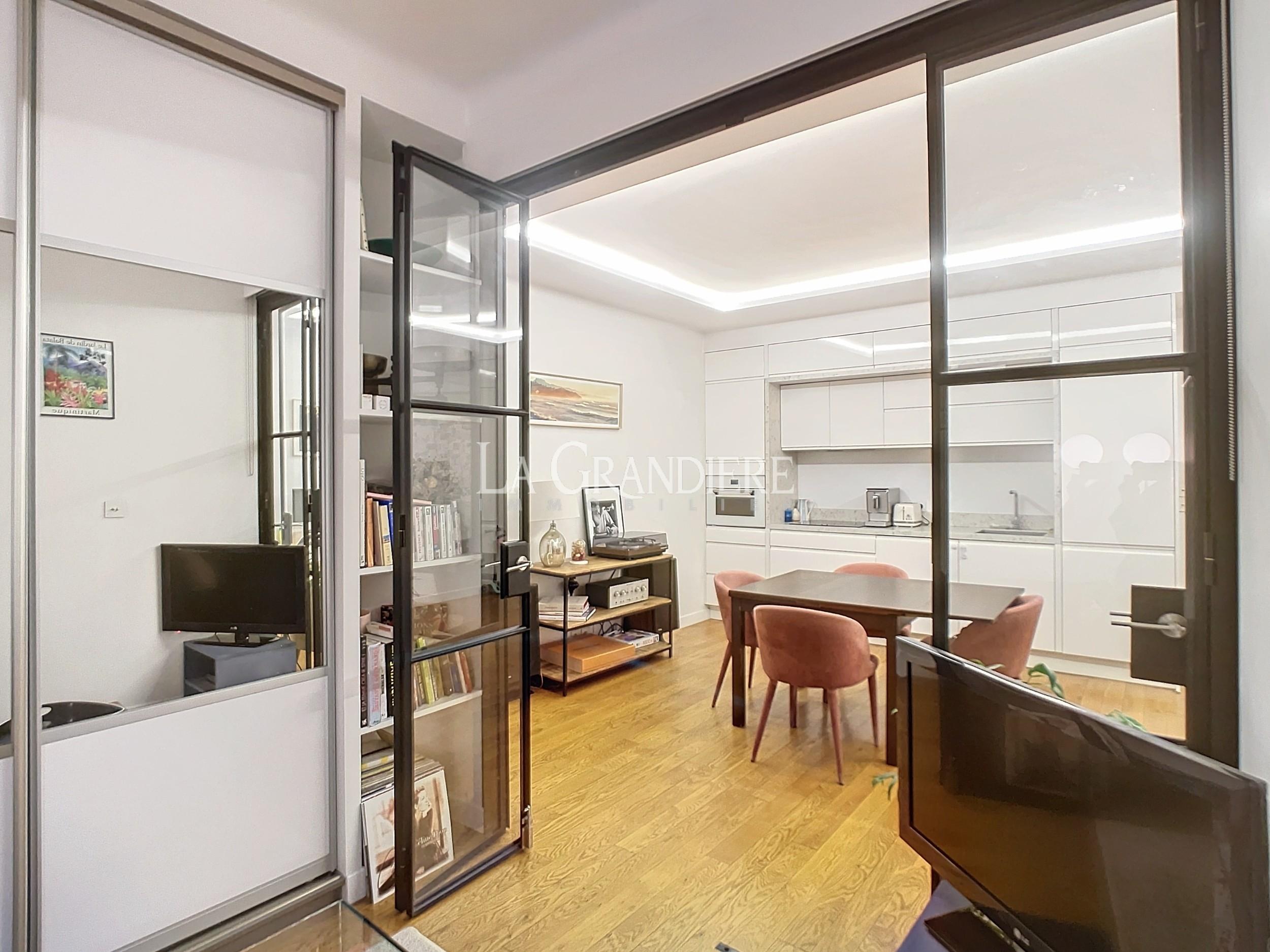 Dans un bel immeuble pierre de taille, ravissant petit appartement en parfait état. Il se compose d’un salon, salle à manger avec cuisine ouverte aménagée et équipée, un couloir desservant deux chambres, une salle de bains avec wc – Cave.