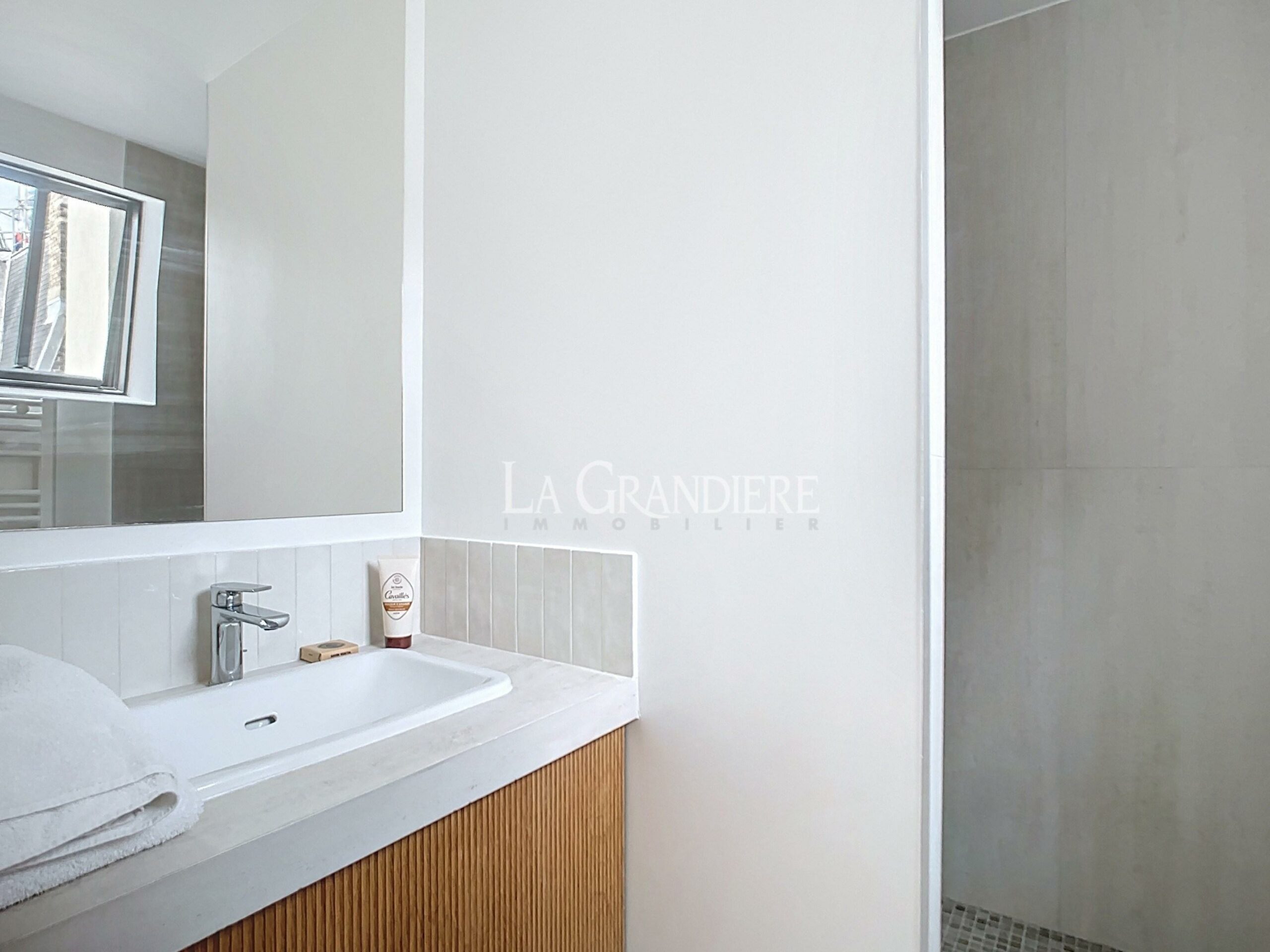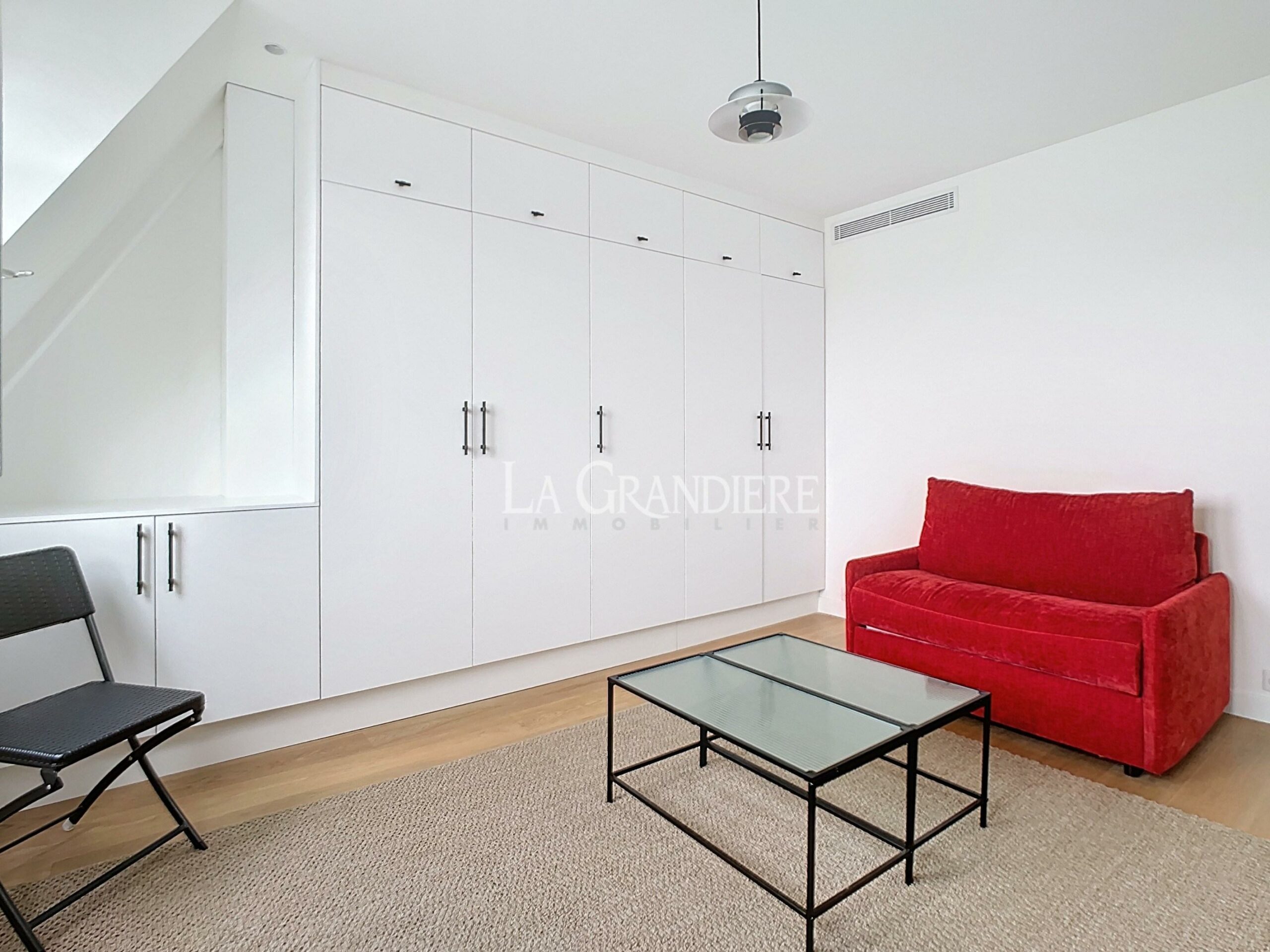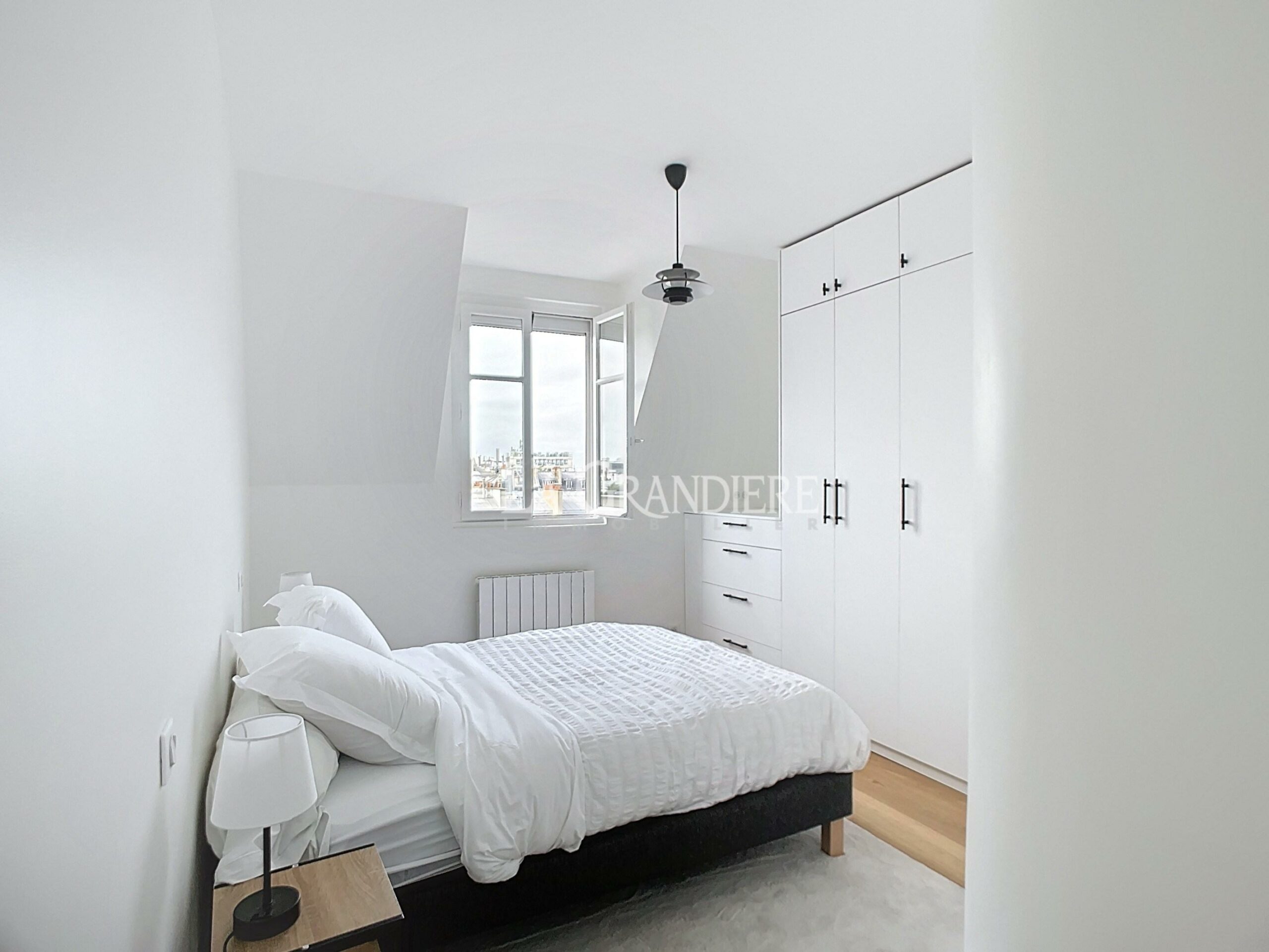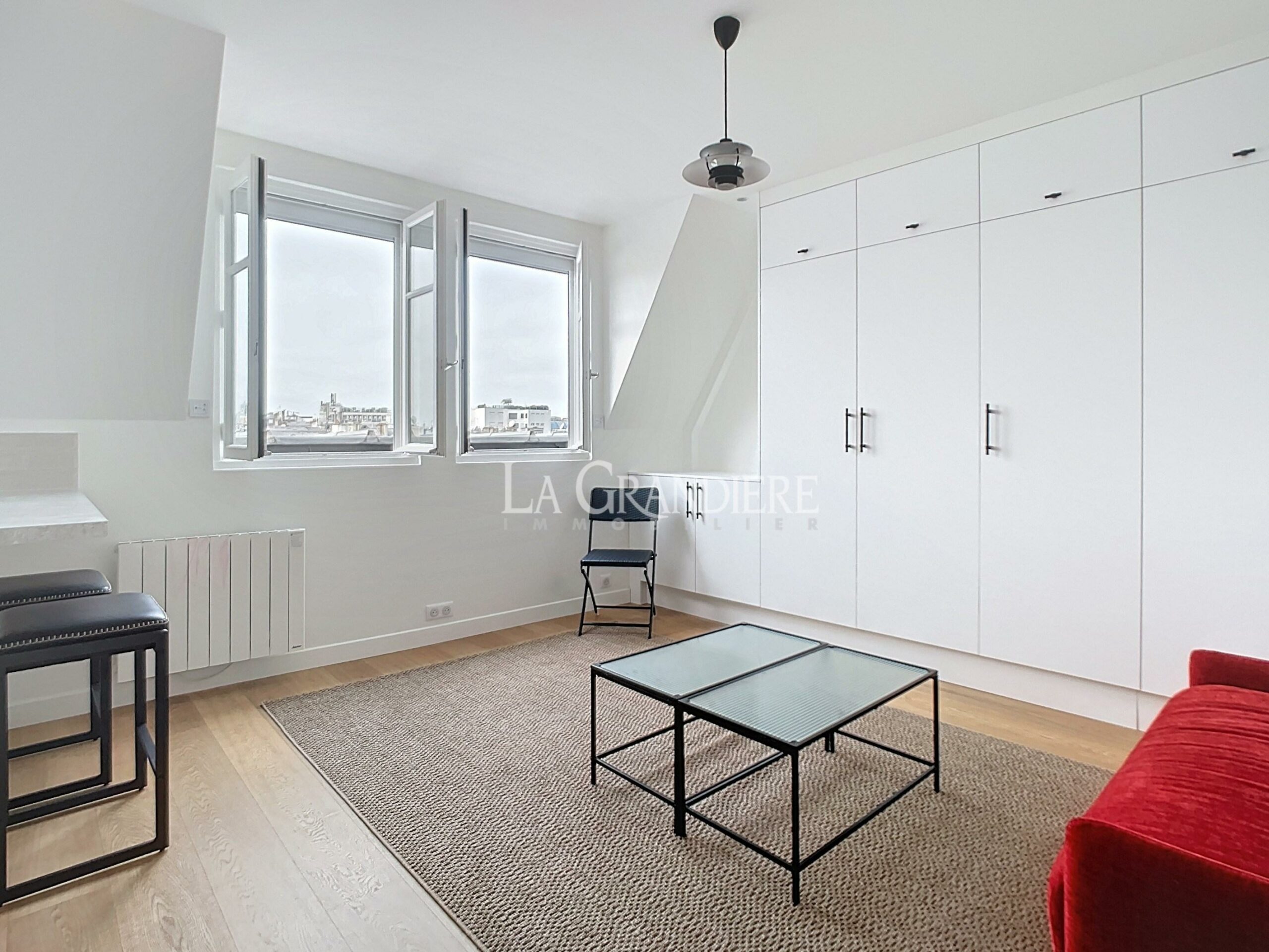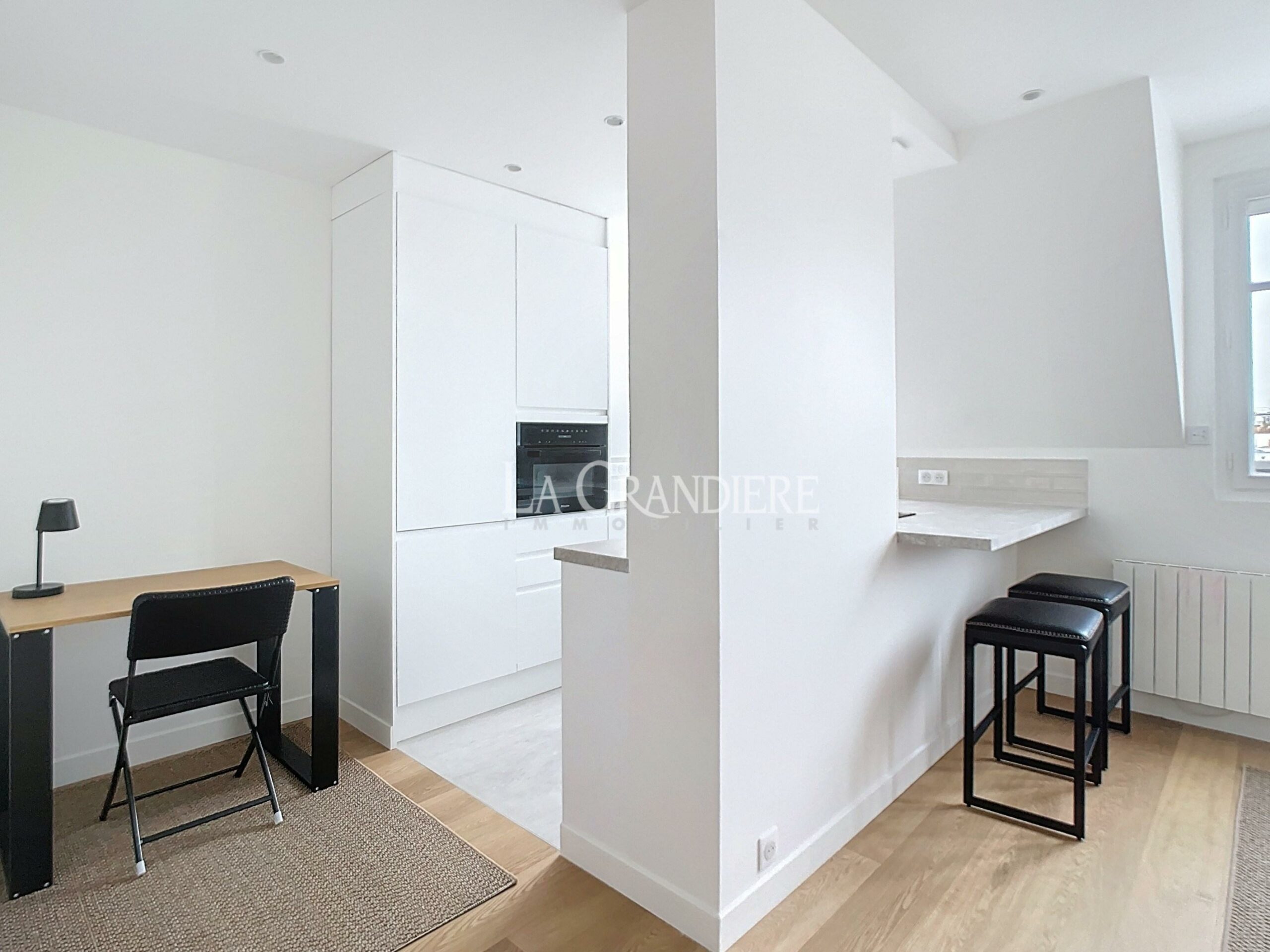 Dans un immeuble de standing de 1928, avec accès par l’entrée de service et avec ascenseur, très bel appartement refait à neuf comprenant une entrée, un salon avec une cuisine ouverte et un coin bureau, une chambre, une salle de douche et un wc séparé. Matériaux et ameublement de grande qualité – Vue toits de Paris – Calme et lumineux – Nombreux rangements – Climatisation.