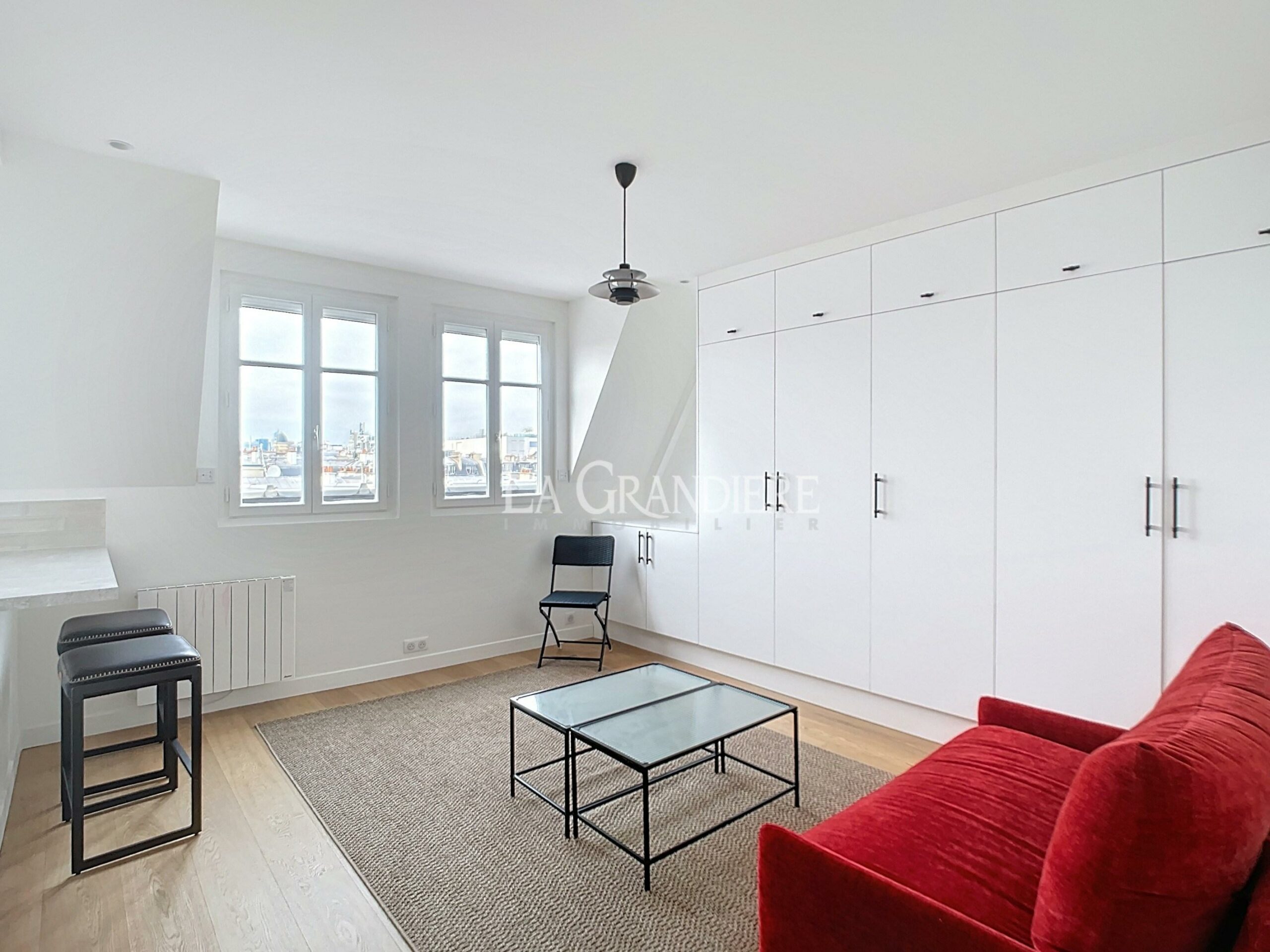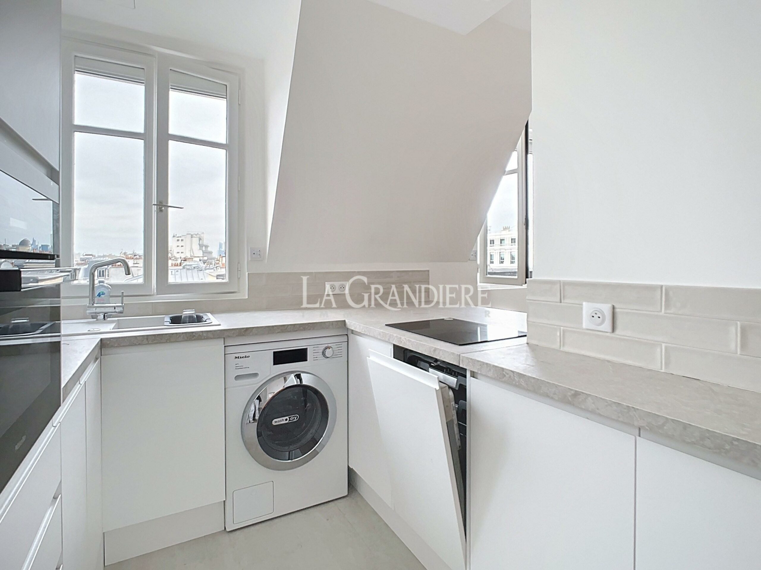 Dans un immeuble de grand standing de 1928, avec accès par le service, très bel appartement refait à neuf comprenant une entrée, un salon avec une cuisine ouverte et un coin bureau, une chambre, une salle de douche et un wc séparé. Matériaux et ameublement de grande qualité – Vue toits de Paris – Calme et lumineux – Nombreux rangements – Climatisation.