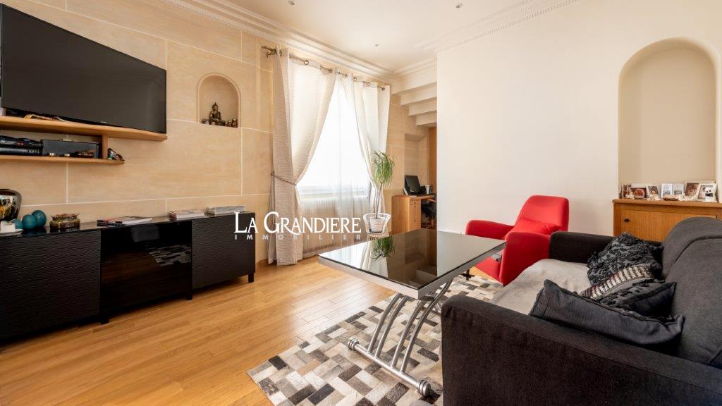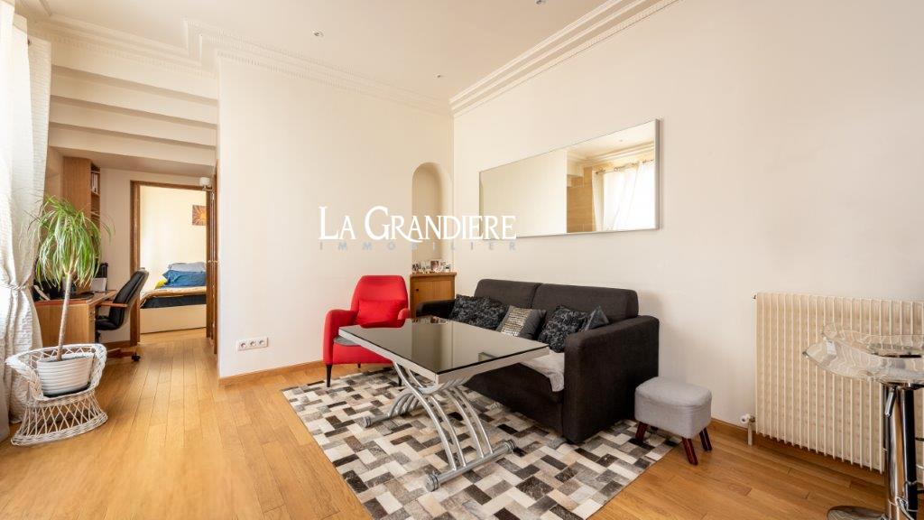 Joli appartement en très bon état dans un bel immeuble ancien. Il est constitué ainsi : une entrée avec placards, un grand salon de 30 m2 comprenant coin bureau et cuisine américaine avec bar, une grande chambre au calme avec de très grands placards, une salle de douche avec douche à l’italienne et des toilettes séparées. RÉNOVÉ AVEC PRESTATIONS DE QUALITÉ. Moulures, parquet, HSP de 3 m – PROFESSION LIBÉRALE POSSIBLE – Cave – Nombre de lots : 102 – DPE : D – Montant des dépenses annuelles d’énergie pour un usage standard : entre 960€ et 1 260€ – Prix : 535 000€ FAI