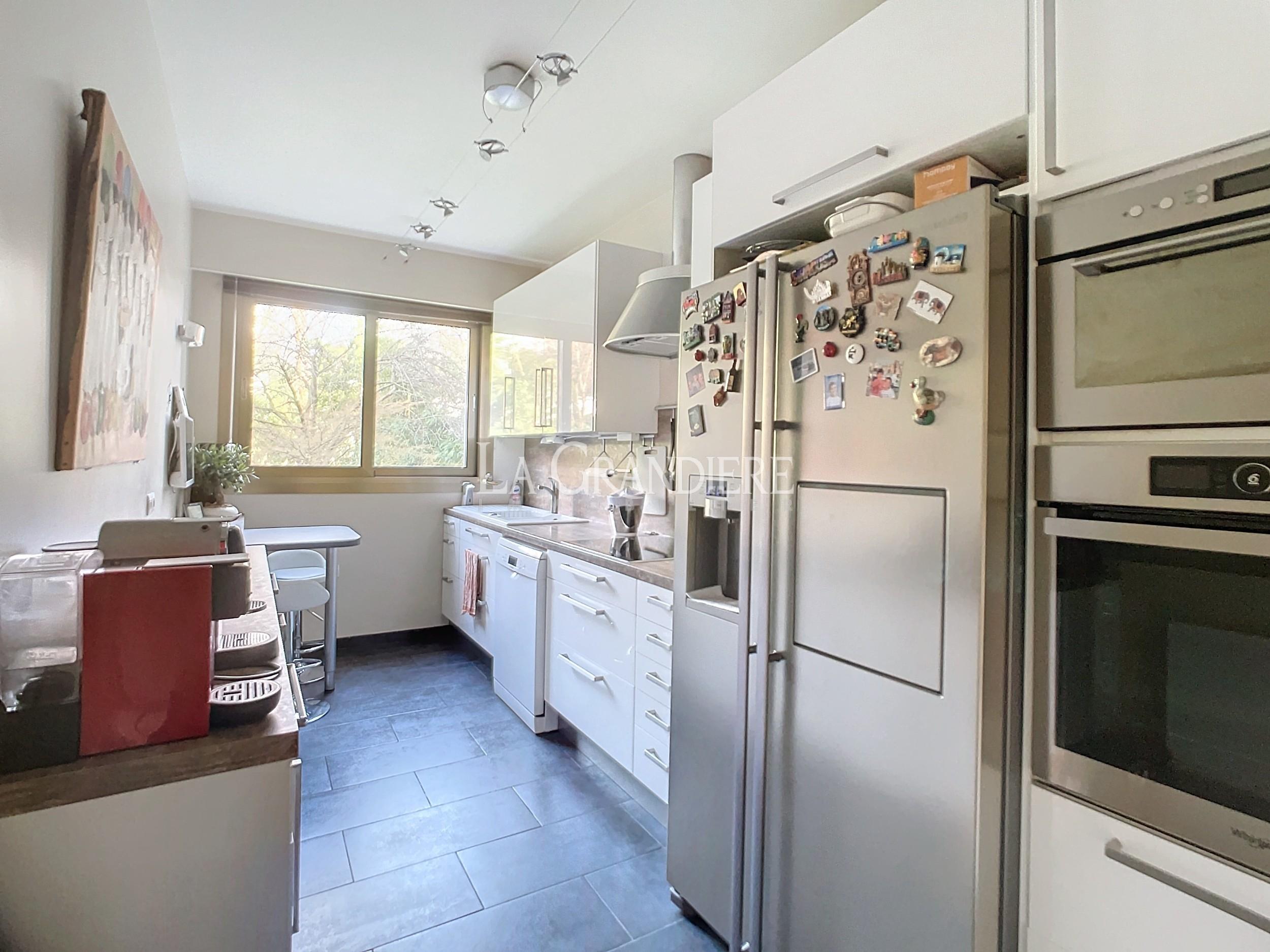 RARE, dans la verdure, sans vis-à-vis, un bel appartement comprenant une entrée avec placard, une double réception donnant sur un large balcon sur jardin, une cuisine, 2 chambres, une salle de bains, une salle de douche avec toilettes, un wc avec lave-mains indépendants. Une cave et un double emplacement de parking (12,50 m) en sus pour 75 000 €. En parfait état, climatisation, prises ethernet, prises pour enceintes. Très bon plan. À deux pas du métro, des commerces.