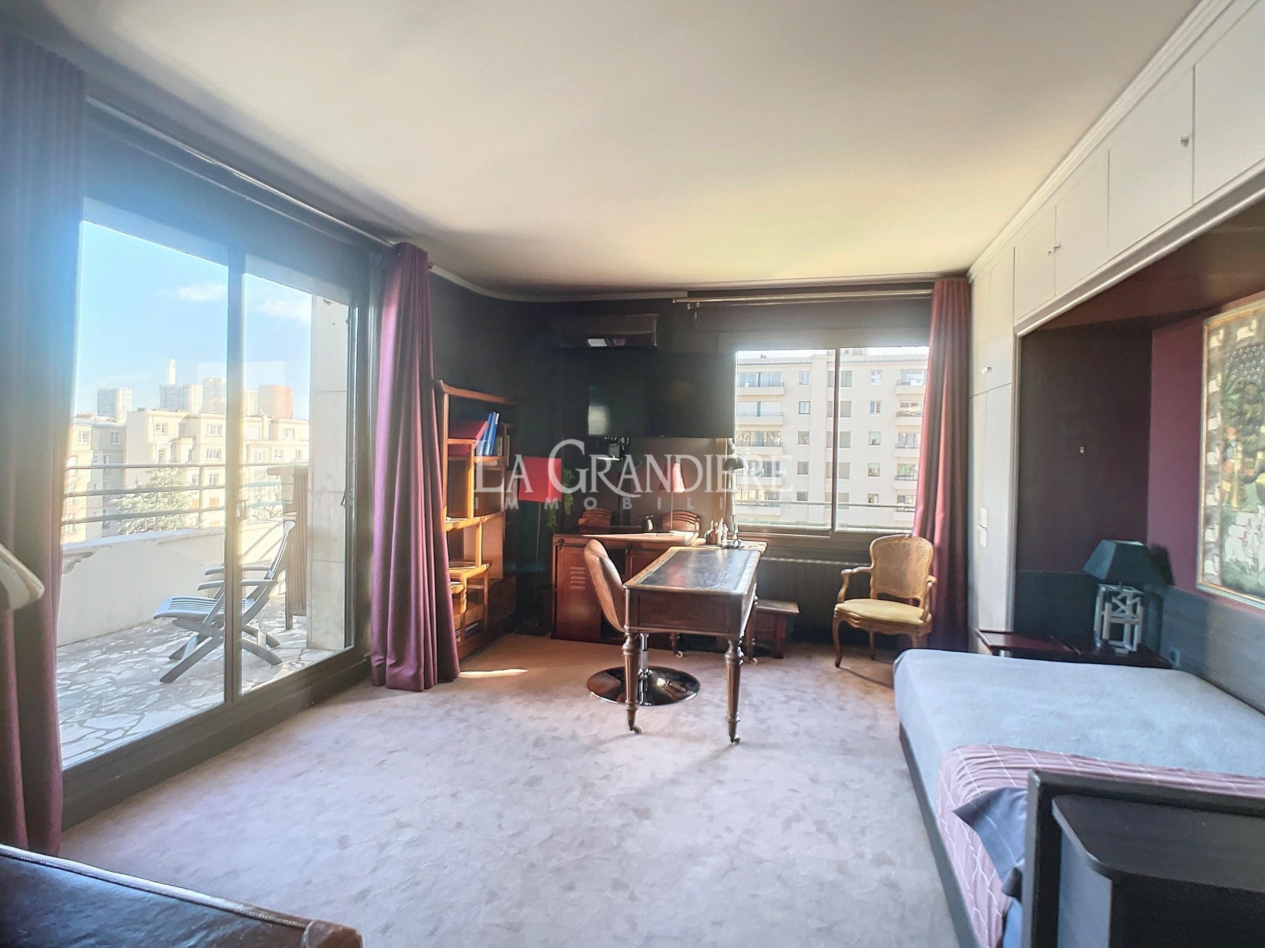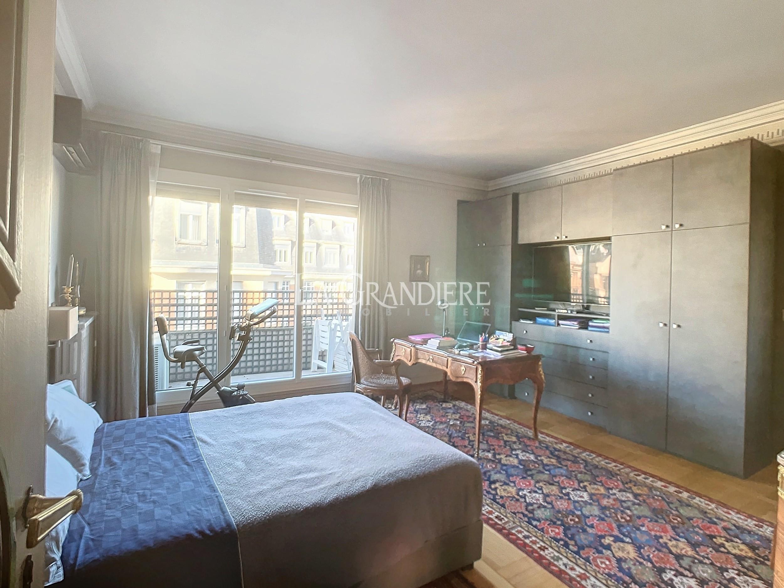 Paris 16 – Jasmin – 6ème étage – 6 pièces – 3 chambres (4 chambres possible) – 153 m2 – Balcon – Terrasse – RARE – À deux pas du métro Jasmin, magnifique appartement familial traversant avec balcons et terrasse. Il se compose actuellement d’une galerie d’entrée, un séjour donnant sur balcon, une salle à manger attenante ou 4 ème chambre, deux grandes chambres dont une avec terrasse de plain pied et vue Tour Eiffel, 3ème petite chambre, deux salles de bains avec wc, un wc séparé – Nombreux placards – Très bonne circulation – Bon plan – Calme absolu – Soleil