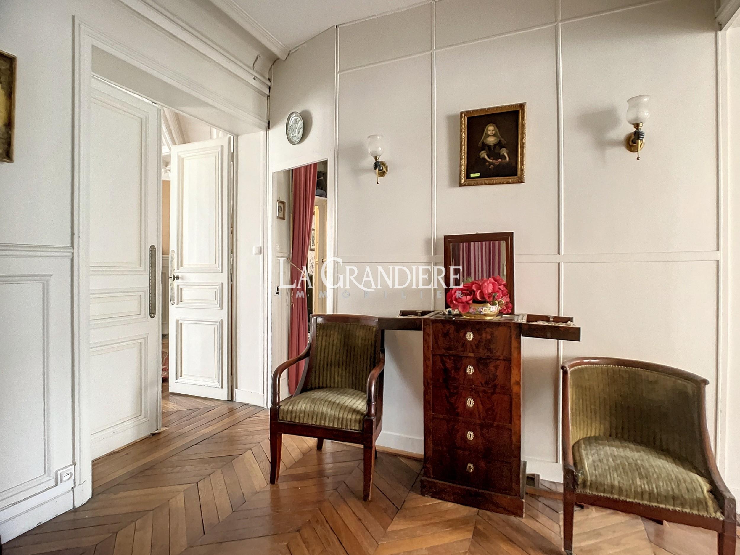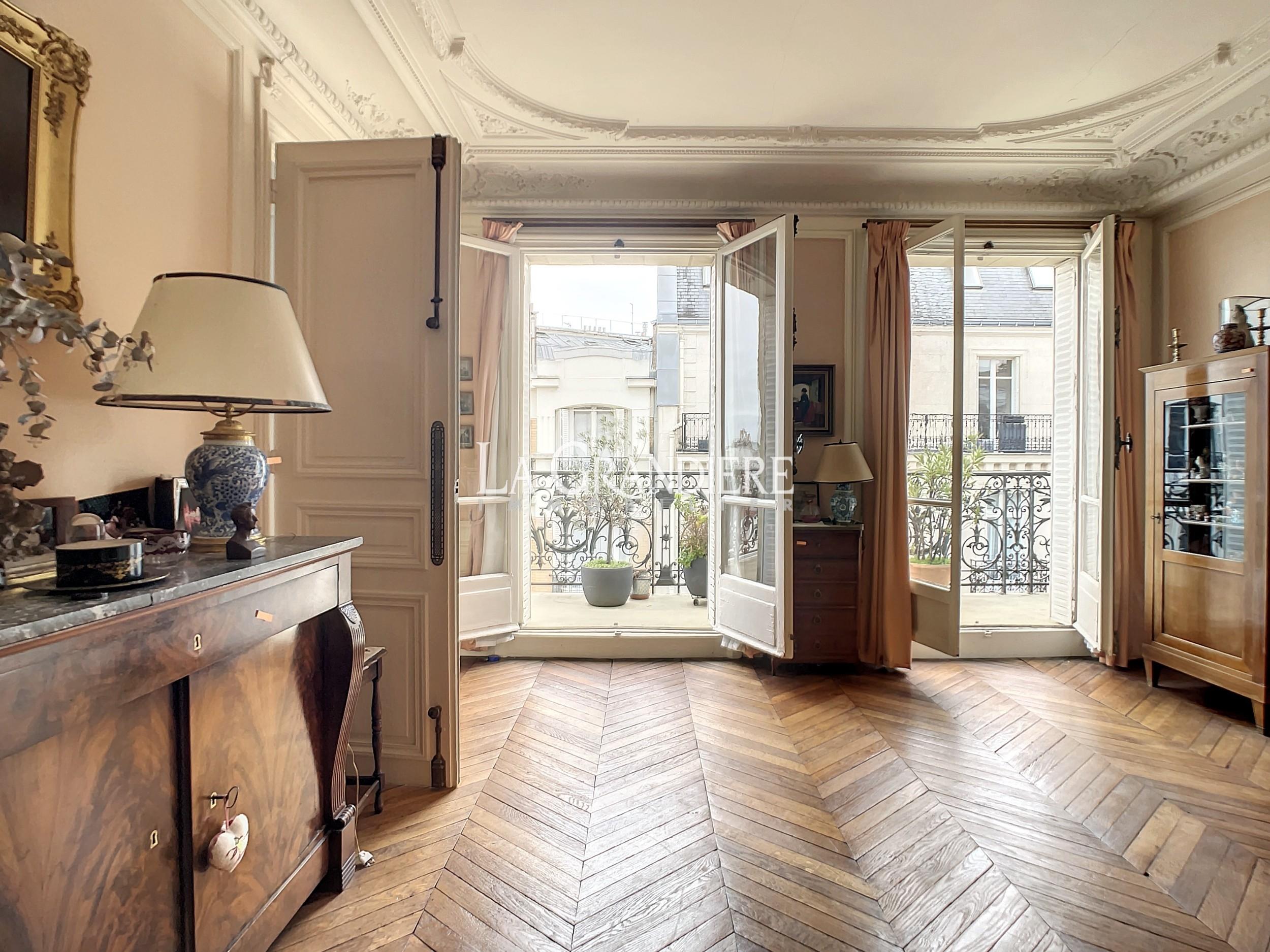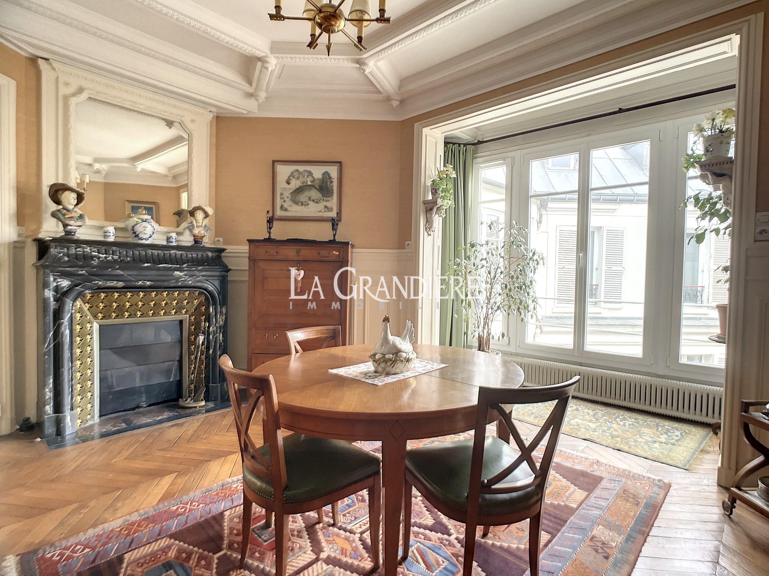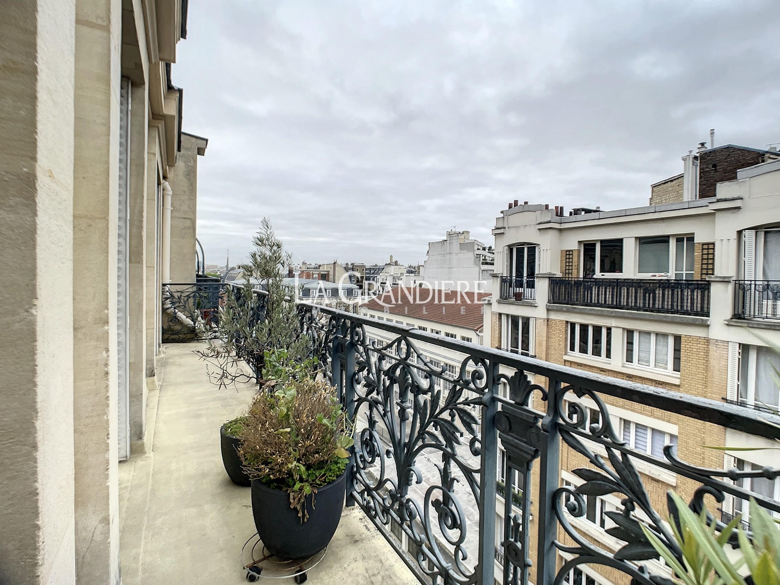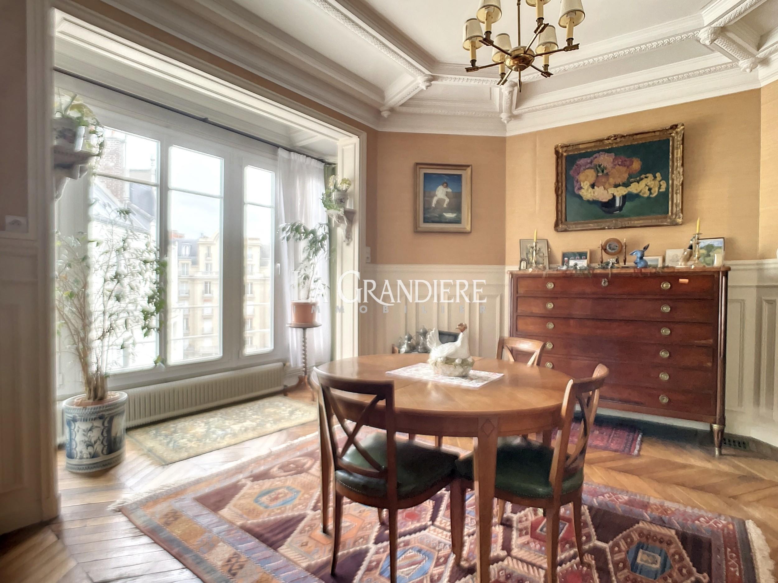 Paris 16ème – Jasmin – Dans un immeuble en pierre de taille de bon standing, situé au 5ème étage avec ascenseur, appartement familial de 152,71 m2 Carrez. Il se compose, actuellement, d’une entrée, un grand séjour, une salle à manger (Sud-Ouest), un couloir desservant 4 chambres, 1 salle de bains, 1 salle de douche, une cuisine. Modulable. Grand balcon 10,74 m2 plein Sud. Cave. Chauffage individuel. Belle hauteur sous plafond 2,93 m. Parquet, moulures, cheminées – À Rénover – Parking possible.