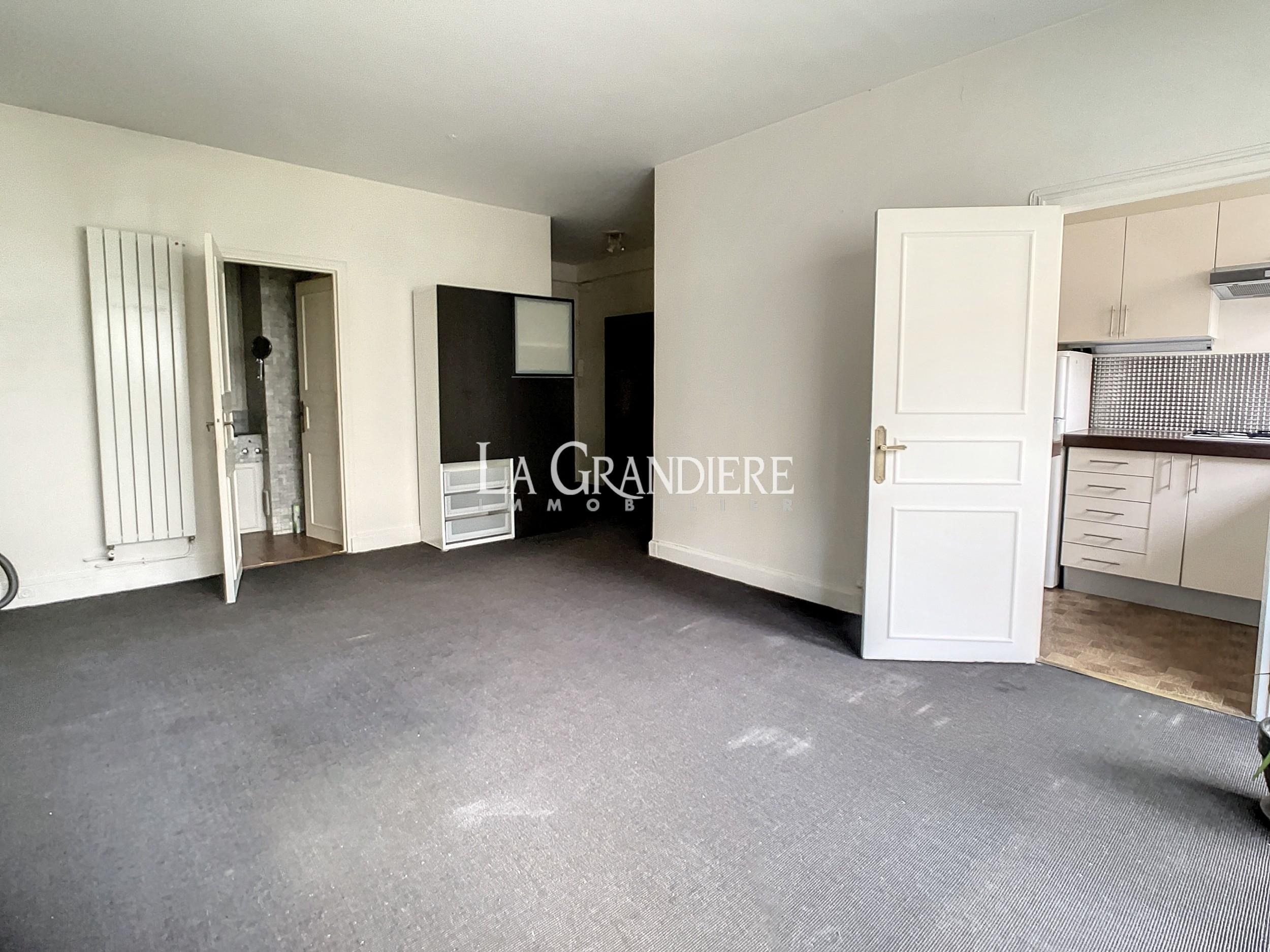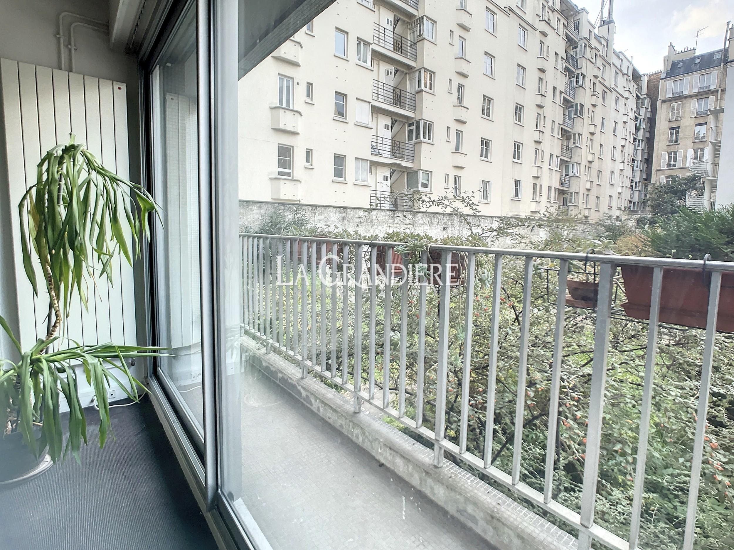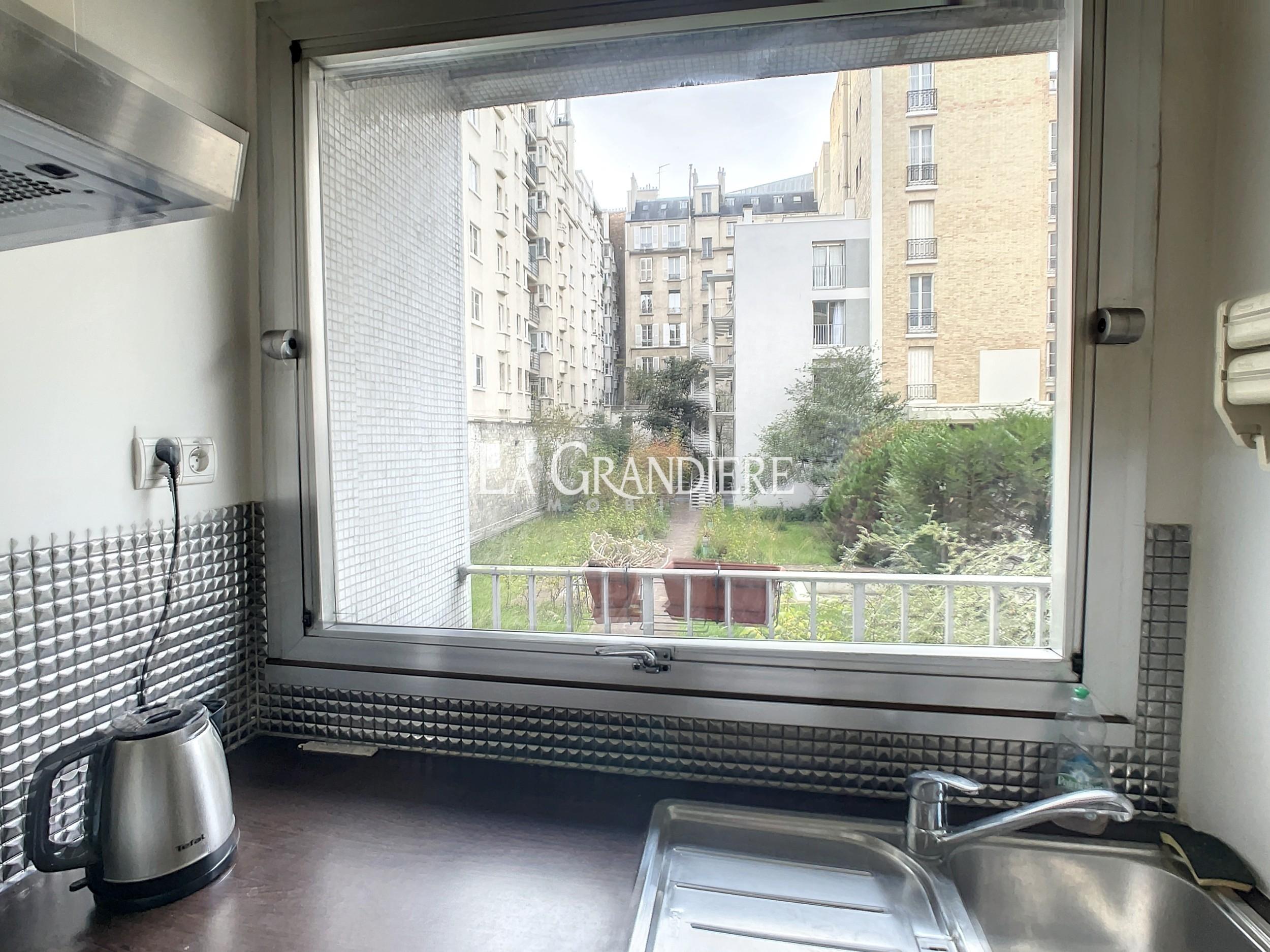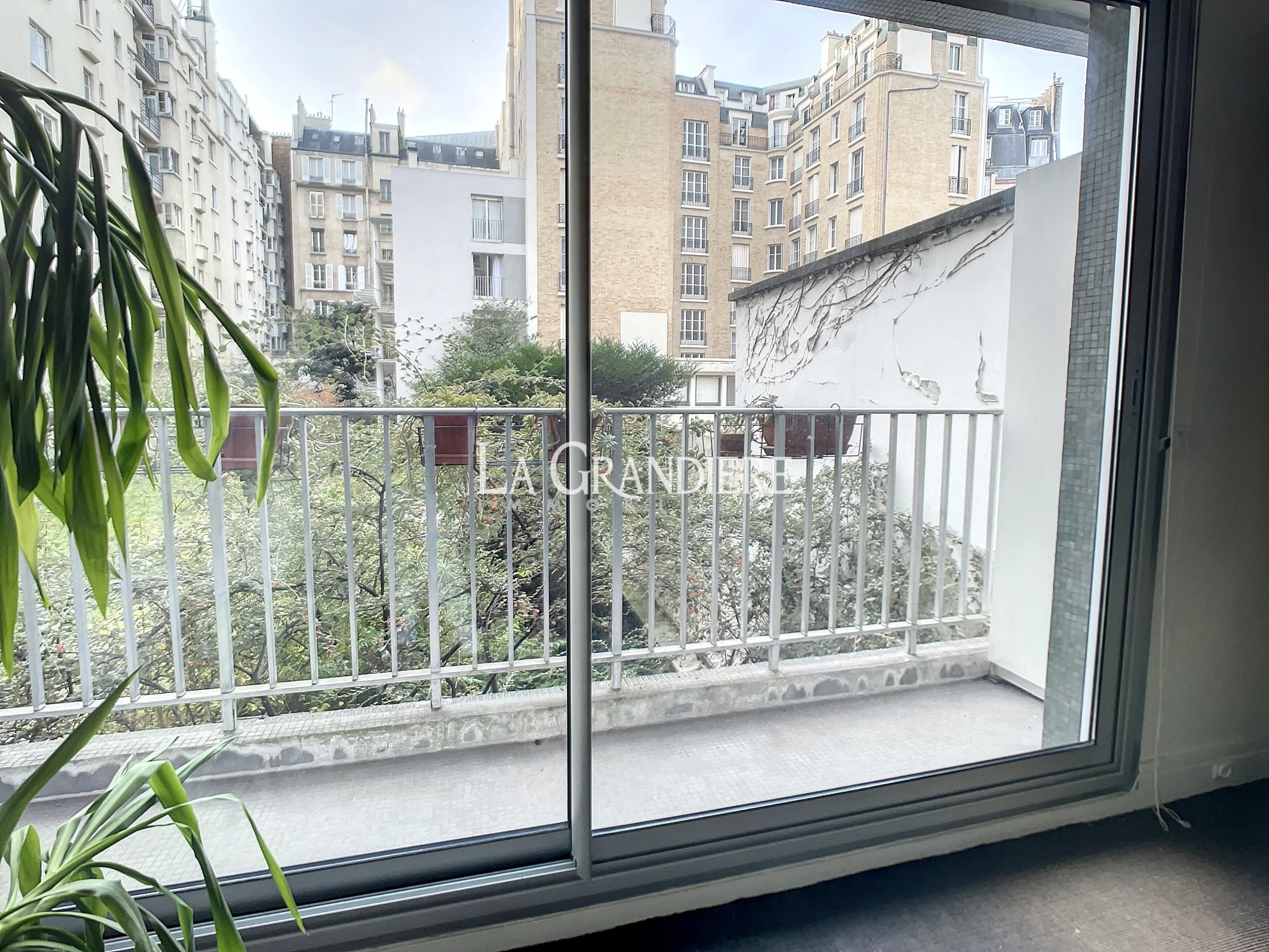 Paris 16ème – Mirabeau – Grand studio au 1er étage d’un immeuble récent composé d’une entrée avec grands placards, une pièce principale donnant sur un large balcon sur jardin, une cuisine séparée, une salle de bains et un wc séparé. Une cave en sous-sol. Chauffage individuel gaz.