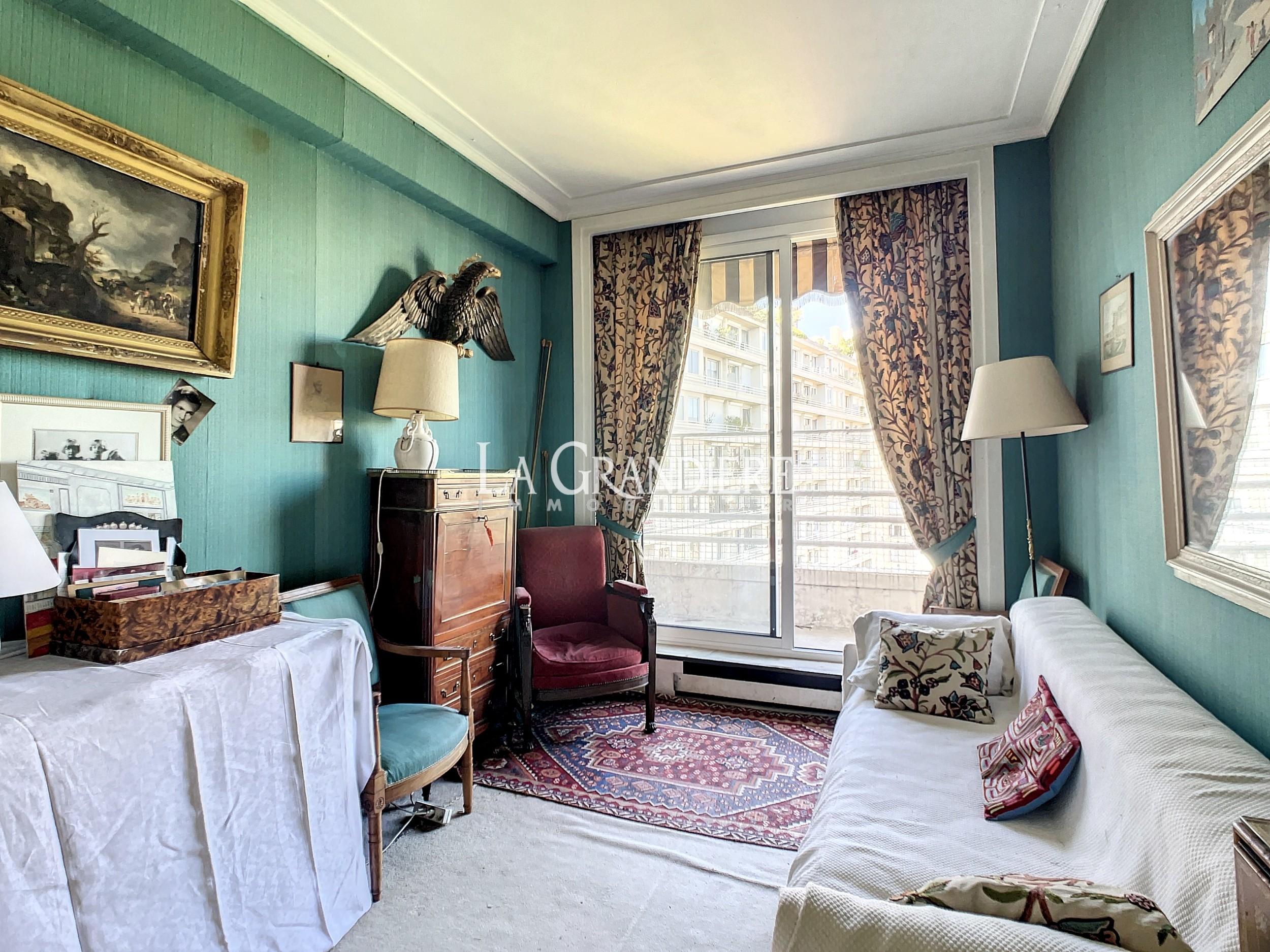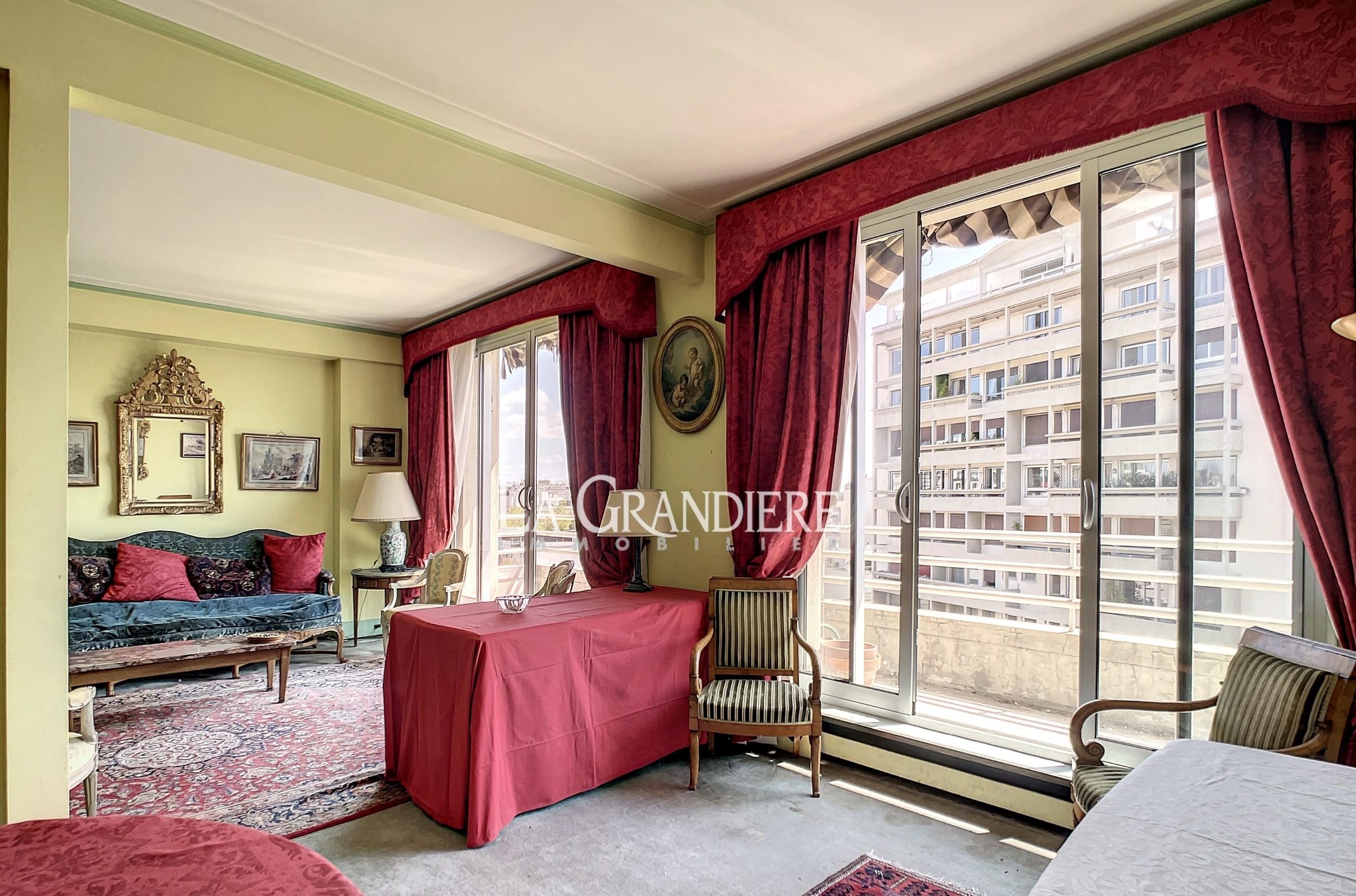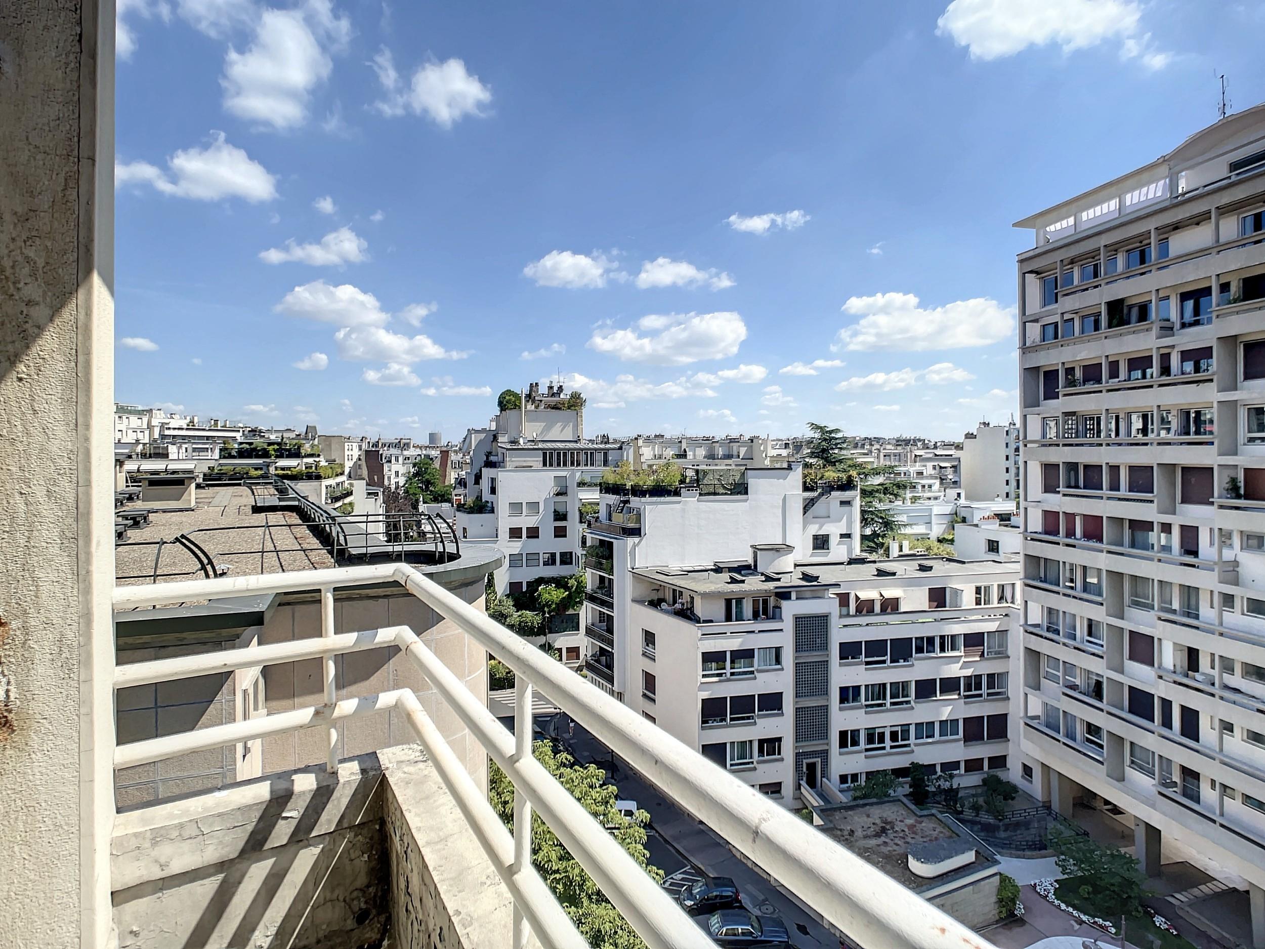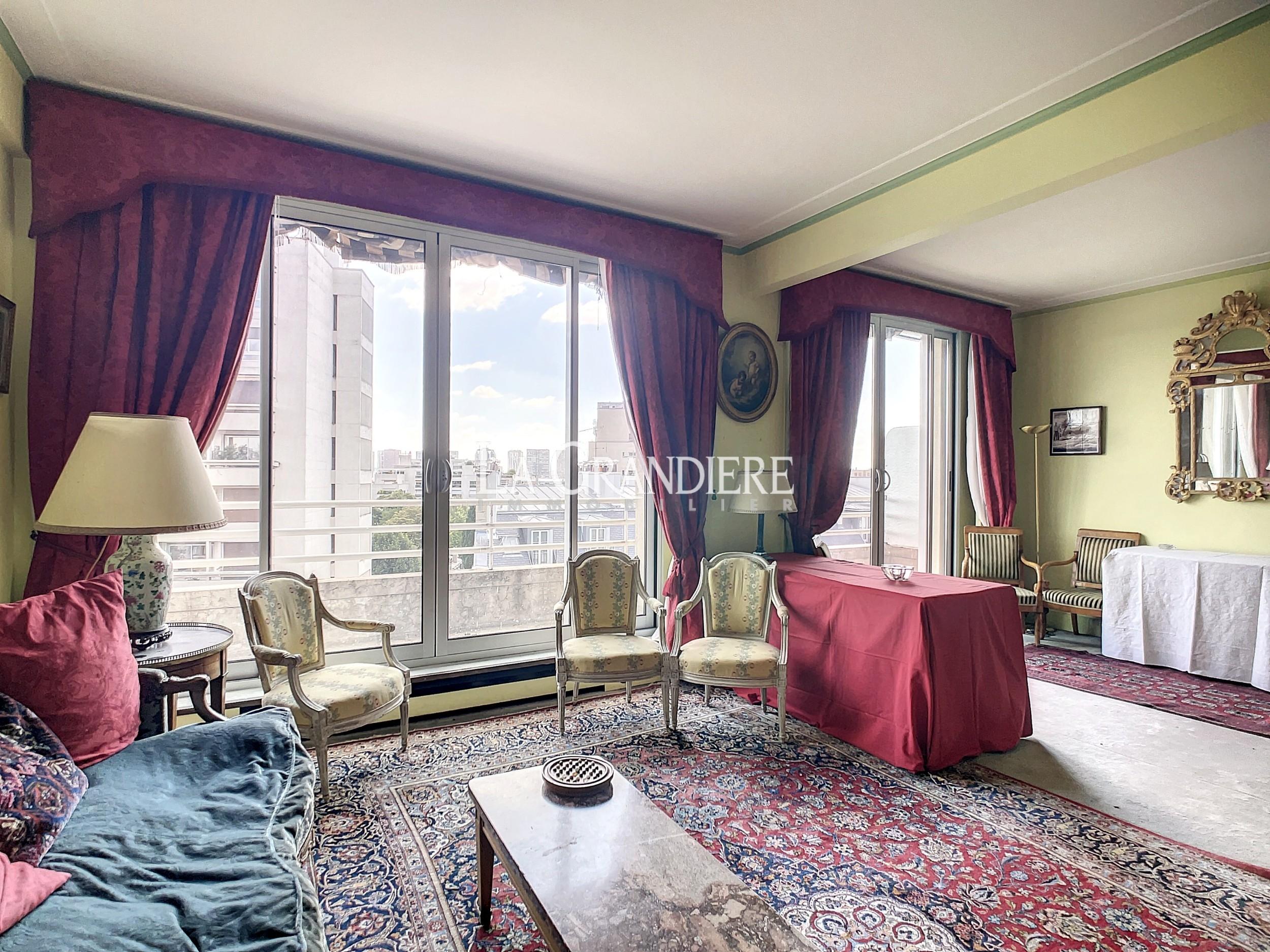 Paris 16ème – Jasmin – Bel appartement de 134m2 au 6ème étage d’un immeuble récent. Calme et ensoleillé. 2 grands balcons. Double réception donnant sur un large balcon. 3 ou 4 chambres. 2 salles de bains. À rénover.