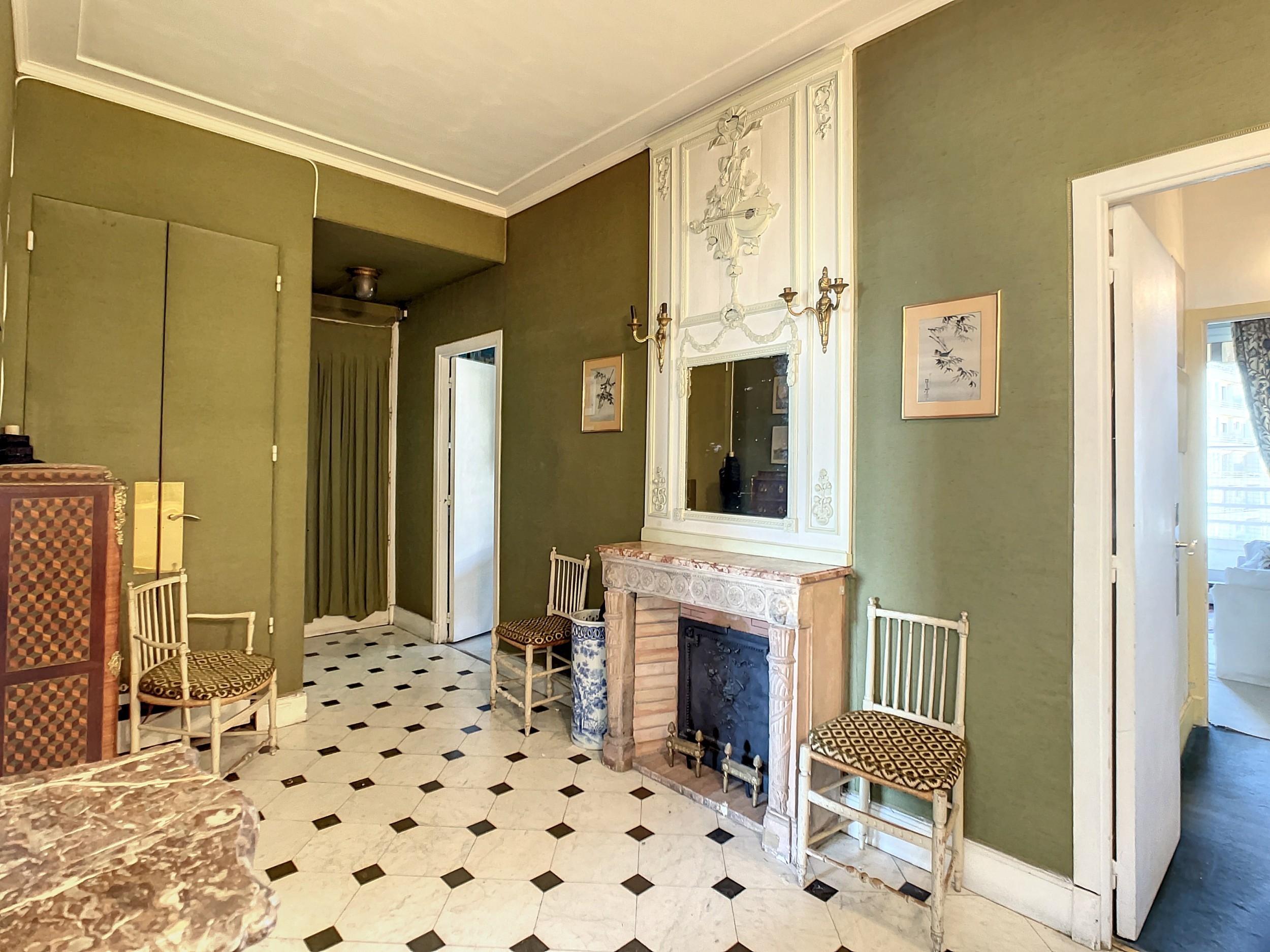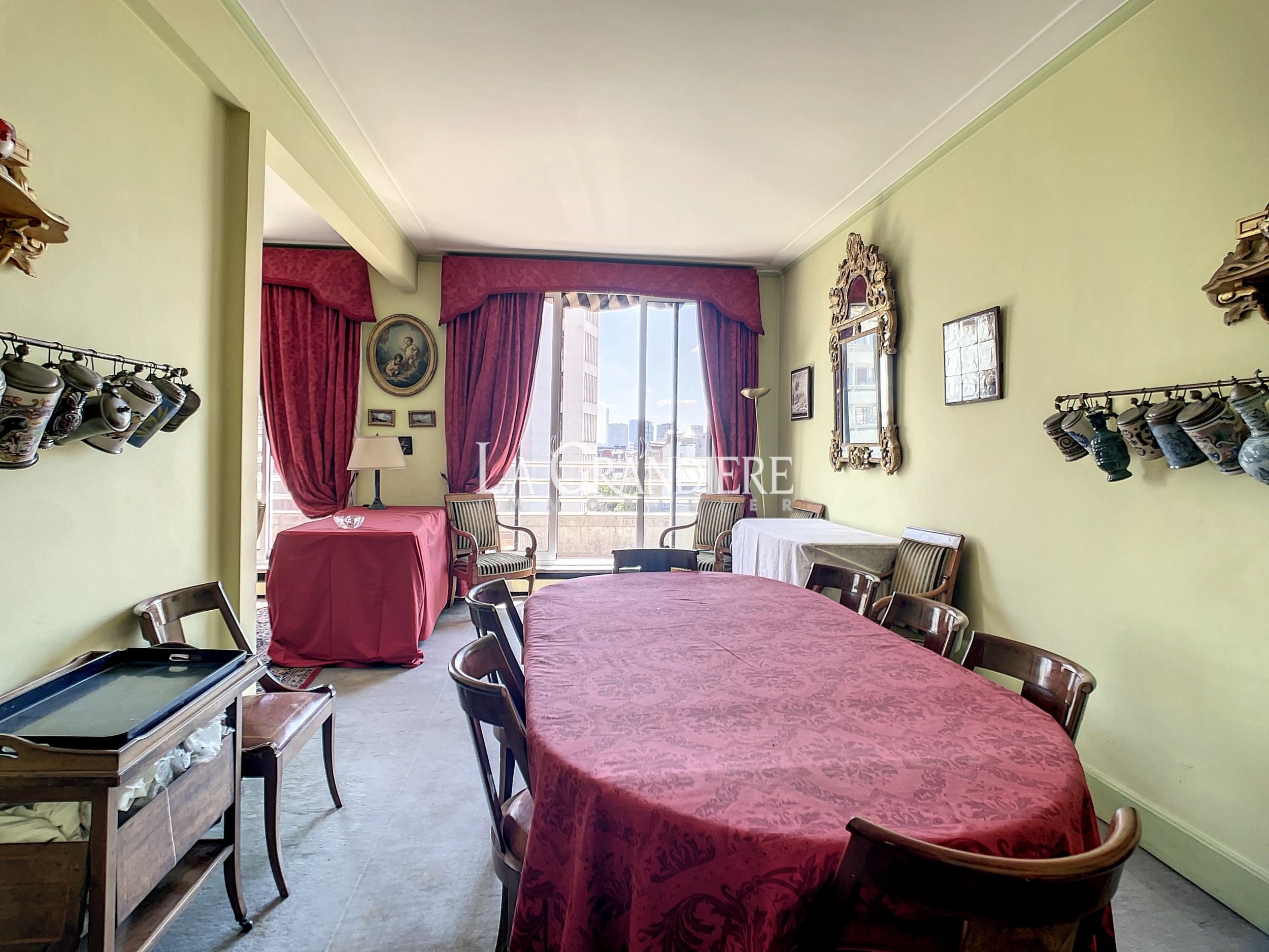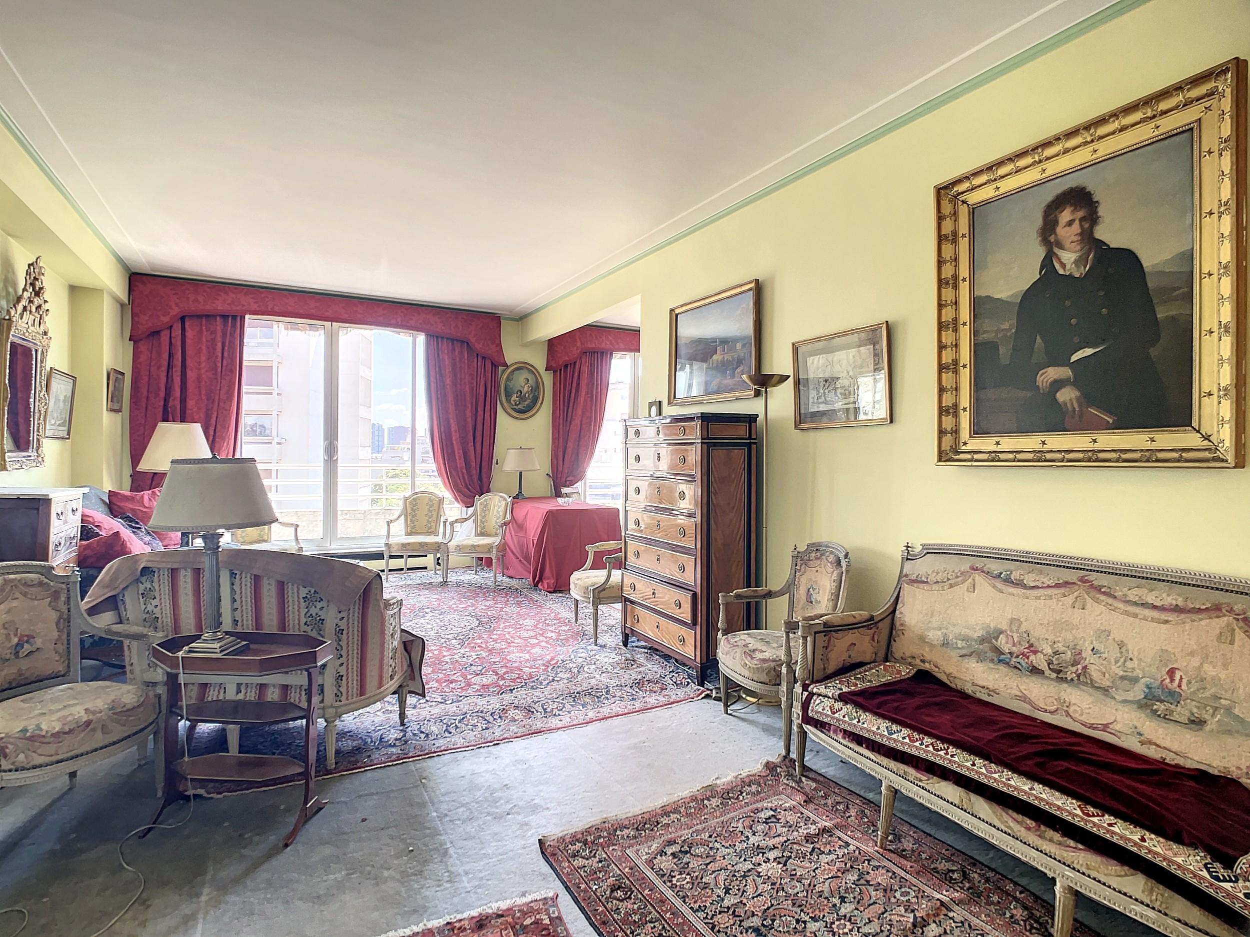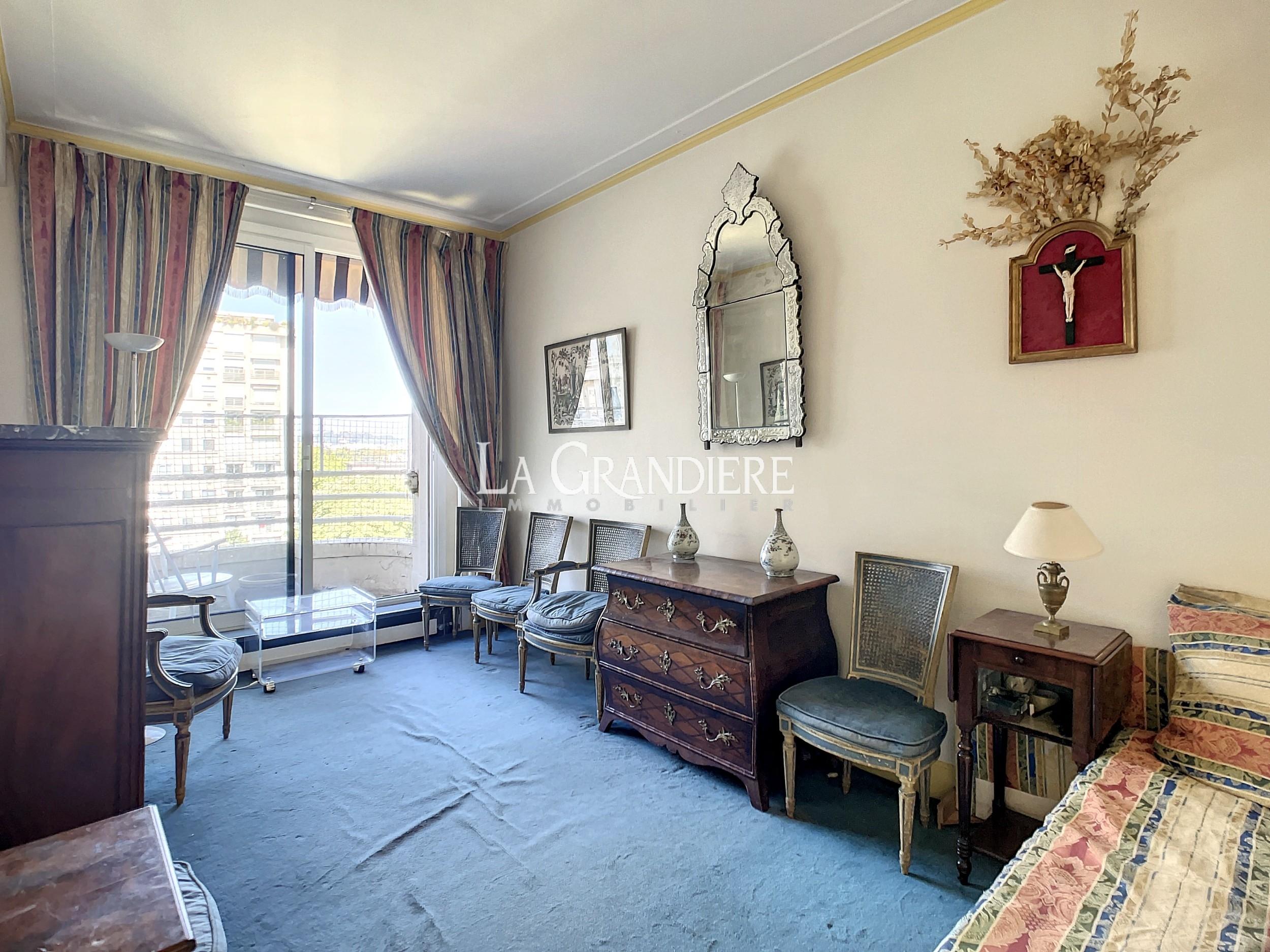 Paris 16ème – Jasmin – Bel appartement de 134m2 au 6ème étage d’un immeuble récent. Calme et ensoleillé. 2 grands balcons. Double réception donnant sur un large balcon. 3 ou 4 chambres. 2 salles de bains. À rénover.