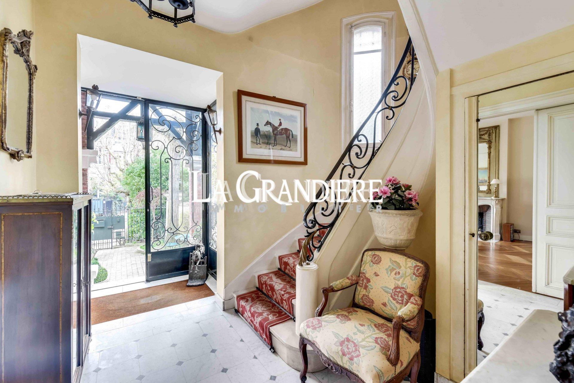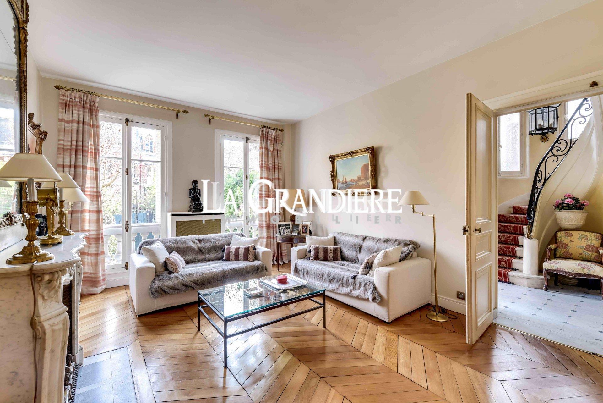 Paris 16ème – Ranelagh – Maison Fin XIXème avec terrasse et jardin dans une impasse privée. Cette maison édifiée sur rez-de-chaussée plus 2 niveaux comprend : entrée, double réception, cuisine, 4 chambres, 2 salles de bains, un studio, 4 wc, placards. Un sous-sol avec 2 caves, un garage, une chaufferie, un cellier. Une terrasse de 12m2 et un jardin de 208m2.