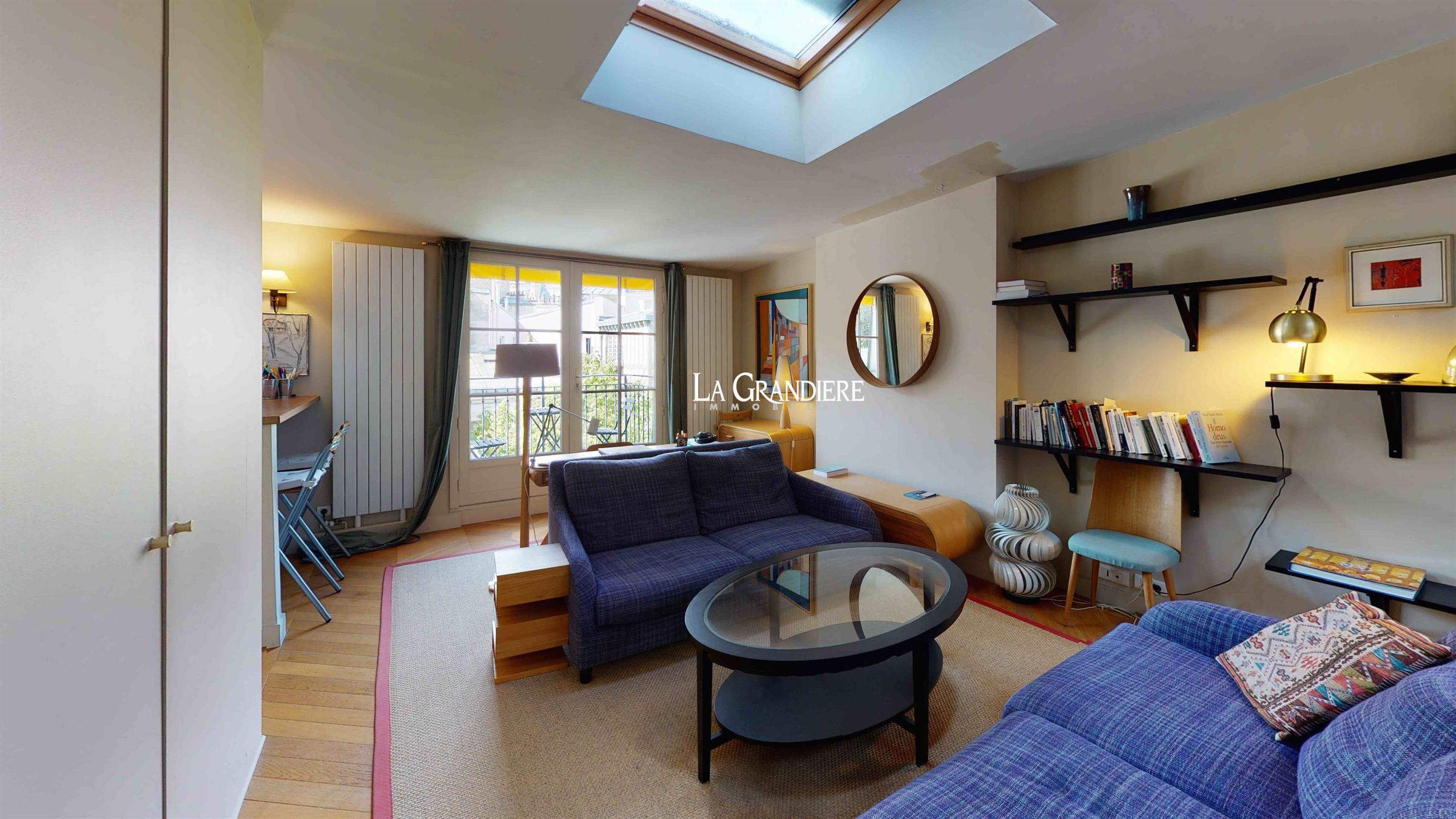 Paris 16ème – Trocadéro – Dans un bel hôtel particulier avec une entrée de prestige, un studio avec balcon plein Sud au 4ème étage. Pièce principale, cuisine américaine, salle de bains. Jardin en jouissance partagée. Calme et en bon état. Exposition Sud. Cave.